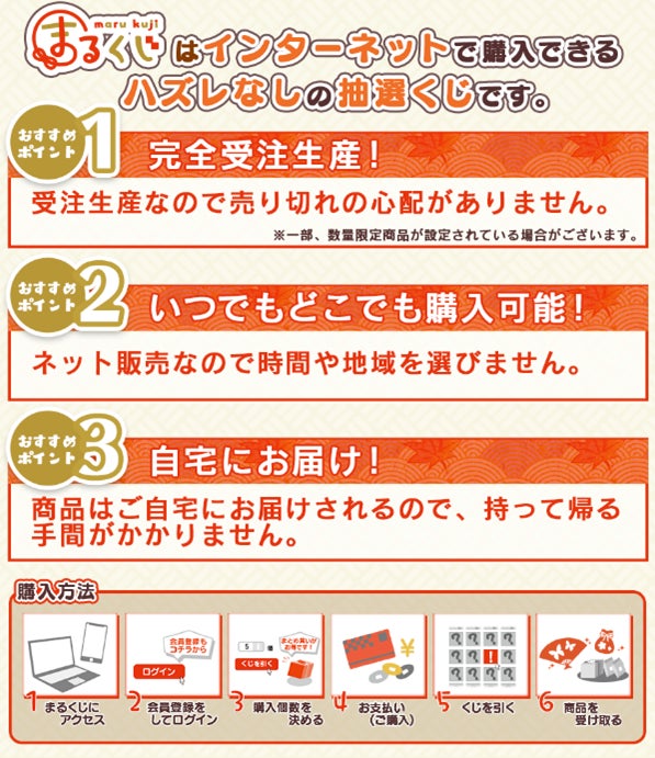 『まるくじ』はインターネットで購入できるハズレなしの抽選くじサービスです。各アイテムがすべて受注生産なので売り切れの心配はありません。(※)