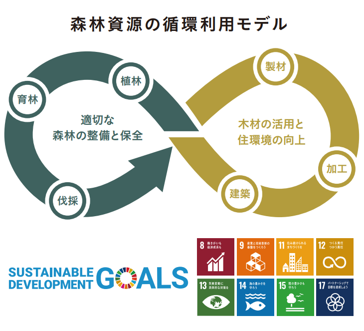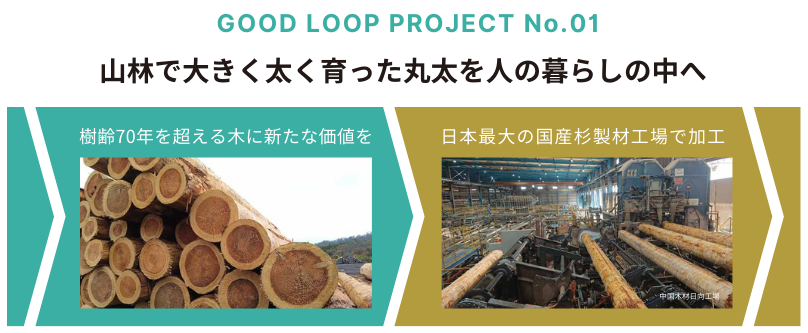 「GOOD LOOP PROJECT」は、日本の木を使い、森を生かし、受け継いでいく、国産材活用プロジェクトです。CO2の吸収力が弱まった伐採期にある木を、耐久性に優れる良質な素材として利用し、木材を活かす「木活建築」を実現します。木を伐って使うことで、また新しい木を植えることができます。そして、成長期の若い樹木はCO2をどんどん吸収して大きくなります。「植える→育てる→使う→植える」というループを推進し、森林資源を未来に受け継いでいくことで、環境課題への貢献とともに、次代の暮らしに恩恵をもたらすはずです。