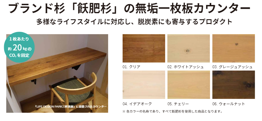 「GOOD LOOP PROJECT」の第一弾は、飫肥杉と呼ばれる高品質なブランド杉を使用した一枚板のカウンターです。建材商社のトーヨーマテリア株式会社をプロジェクトに加え、より多様なニーズにお応えする商品企画を実現しました。無垢の存在感は、樹齢70年を超える大径木ならでは。太く育った丸太から製材された無垢の一枚板を丁寧に仕上げました。時間の経過とともに味わい深い変化を楽しむことができます。カウンター1枚あたり約20kgのCO2を固定、脱炭素社会に寄与するプロダクトです。