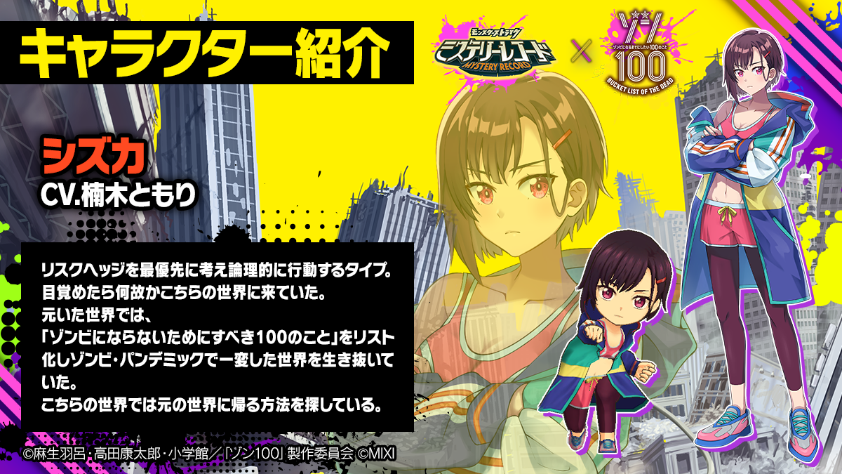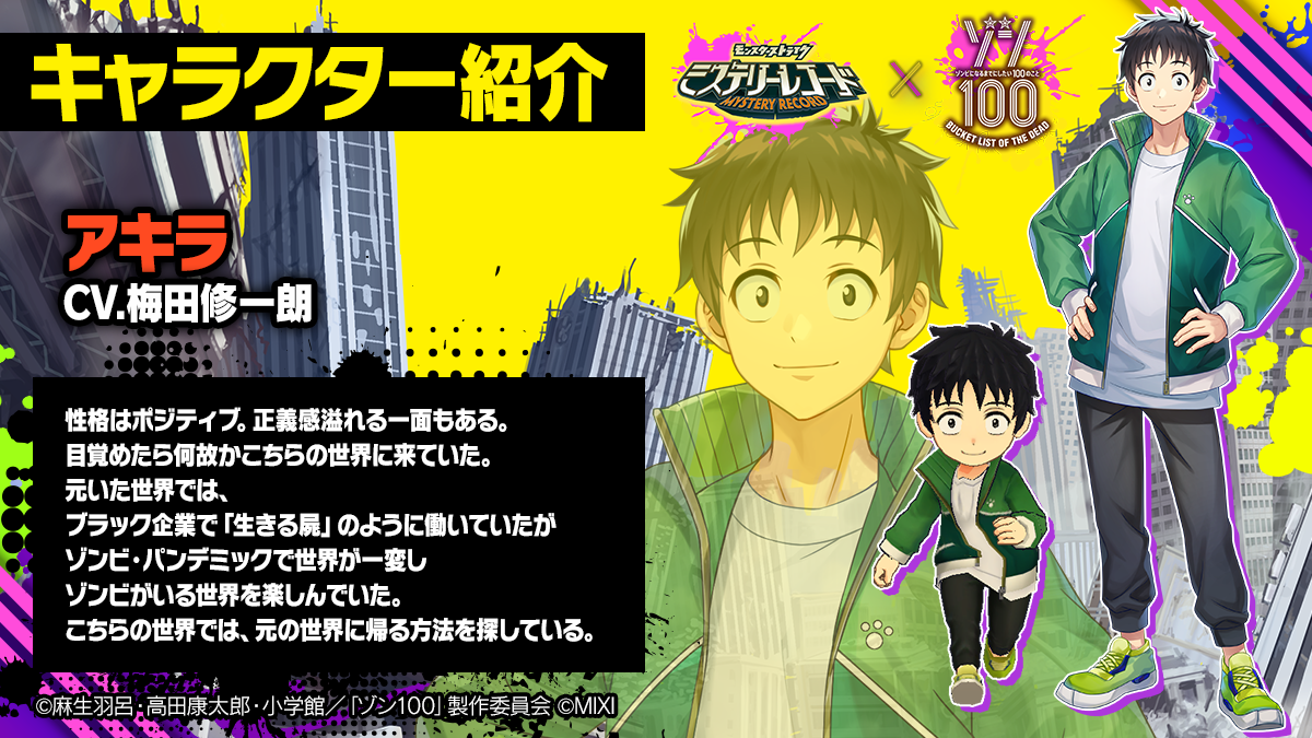 本コラボでは、コラボキャラクターの「アキラ」と「シズカ」がプレイヤーキャラとして新登場するほか、コラボ期間中は敵として「ゾンビ」が追加されるなど、TVアニメ「ゾン100~ゾンビになるまでにしたい100のこと~」の世界観を表現したイベントを開催します。