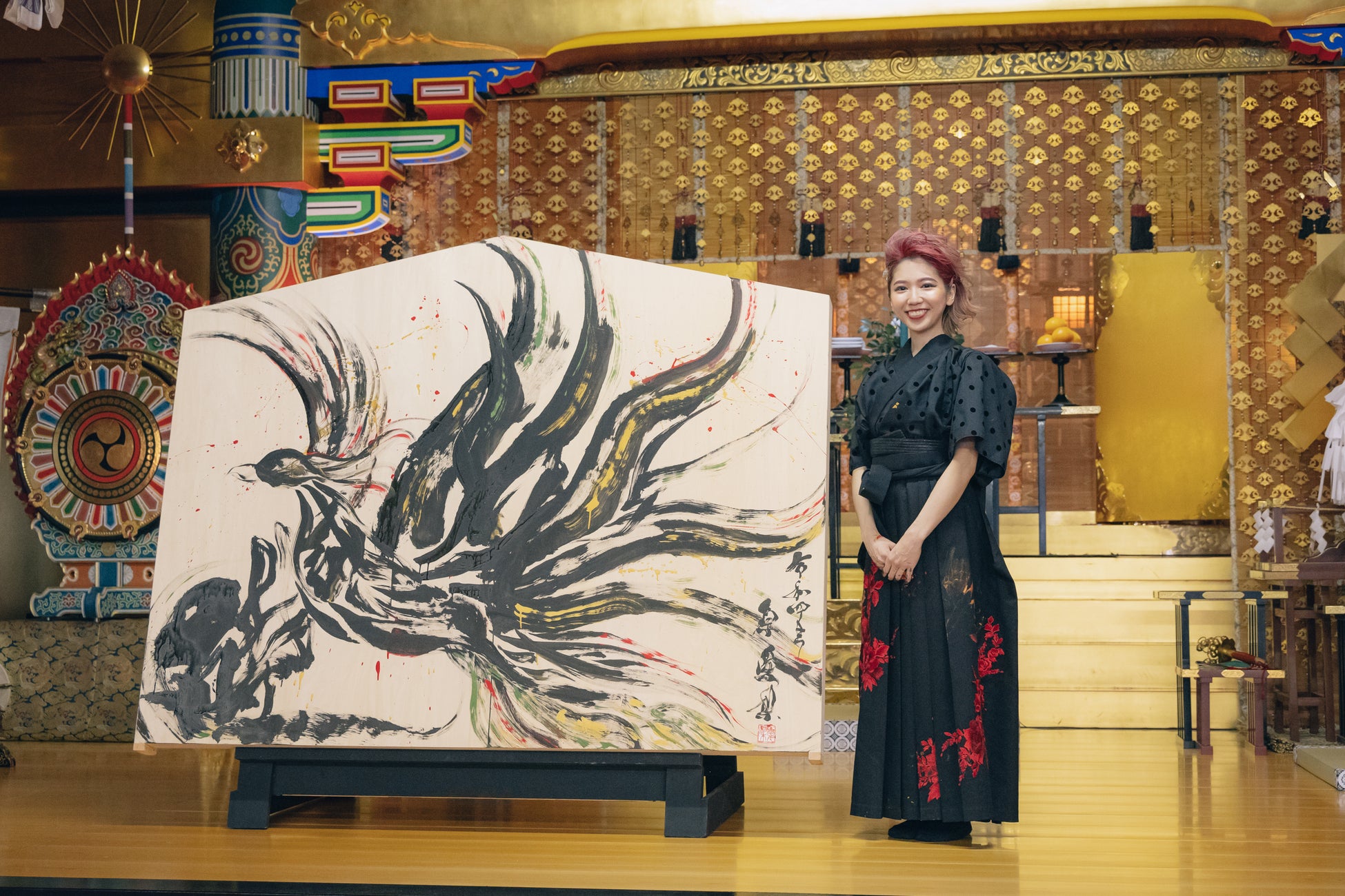 今回特別に用意された140cm×180cmの巨大な絵馬に原が書いたのは、4つの文字(幸・求・与・感)からなる鳳凰の作品。絵馬に作品を書くのは初めてという原でしたが、キリっとした眼差しで作品と向き合い、見事作品を完成させ、大きな拍手に包まれました。