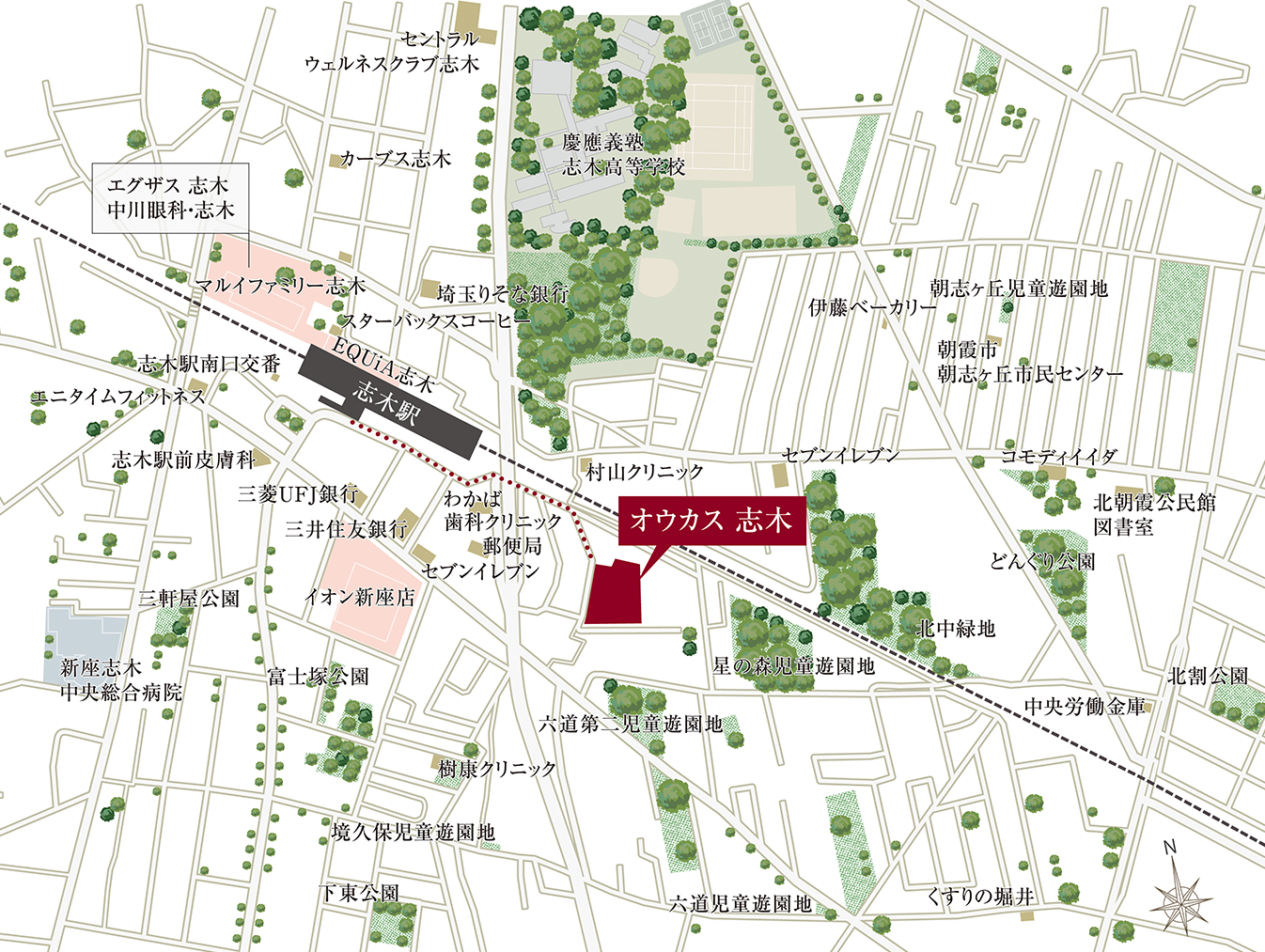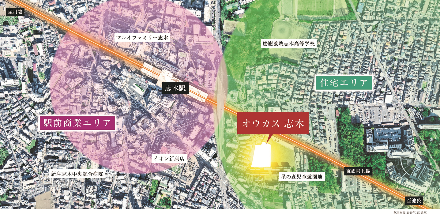東武東上線「志木」駅徒歩6分と、駅至近で誕生する「オウカス志木」。徒歩圏に総合病院やクリニック、スーパー、飲食店があるとともに、緑が多く落ち着いた住環境のエリア内に存在し、自立した暮らしを愉しめる立地です。