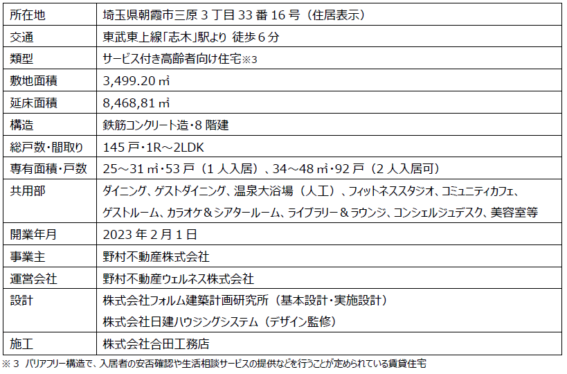 野村不動産株式会社(本社:東京都新宿区/代表取締役社長:松尾大作、以下「野村不動産」)および野村不動産ウェルネス株式会社(本社:東京都新宿区/代表取締役社長:松本裕樹、以下「野村不動産ウェルネス」)は、入居者及び家族の皆様の健康寿命の延伸を支援することで、「世界一の人生づくり」を目指す健康増進型・賃貸シニアレジデンスのシリーズ「OUKAS(オウカス)」の第5弾となる「オウカス志木」(全145戸)が2022年10月31日に竣工し、2023年2月1日に開業することをご報告いたします(埼玉県初出店)。