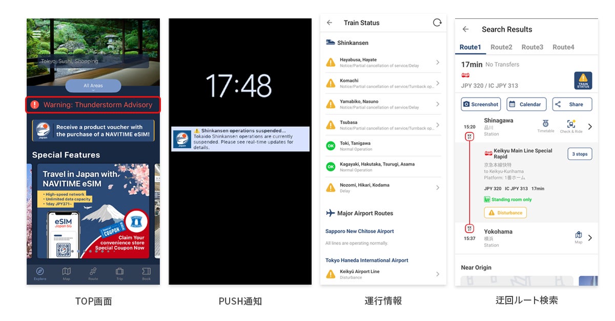 これまでも『Japan Travel by NAVITIME』では、警報情報をアプリのTOP画面や一覧表示、PUSH通知で知らせる機能、運行情報、運行情報を考慮した迂回ルート検索機能を提供してきました。Push通知は、震度3以上の緊急地震速報、津波警報、噴火速報、気象警報、台風情報をプッシュ通知でお知らせします。運行情報では、新幹線や空港アクセス路線のほか、現在地周辺やユーザーが登録した「My Hotel」周辺の情報を一覧表示で確認できます。