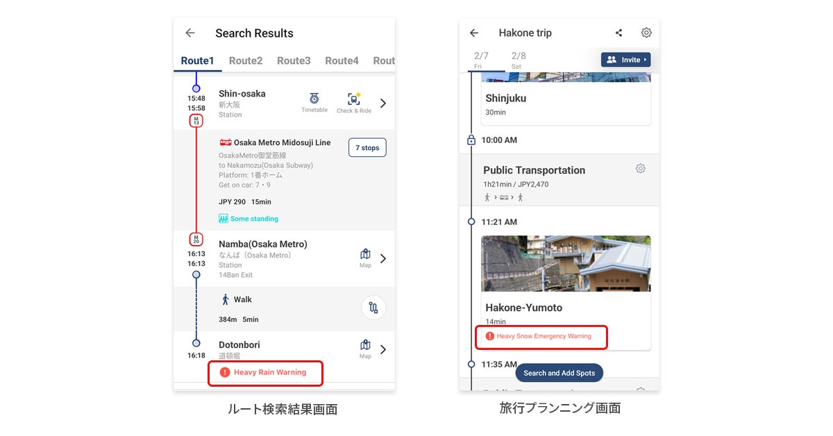 ユーザーが作成した旅行プラン画面やルート検索結果画面に、警報情報を表示します。ルート上や目的地の災害リスクを確認できるようにすることで、事前の旅行計画段階で現地の警報情報を把握できます。災害状況に応じた準備や、行き先を再検討することの一助としてご活用できます。