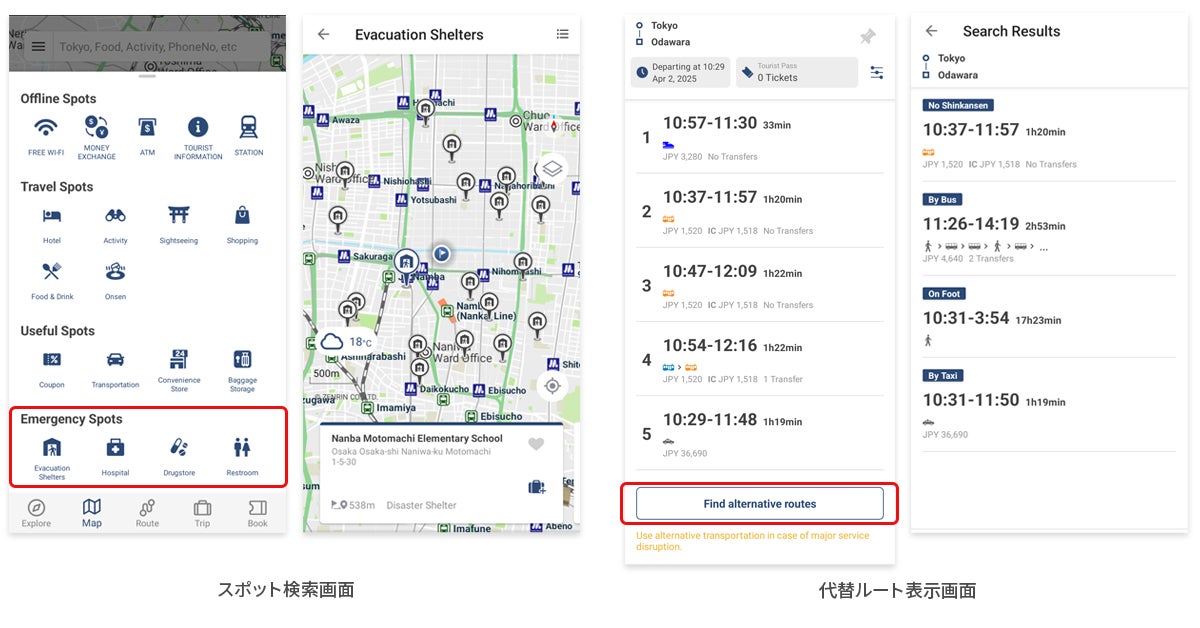今回のリニューアルでは、旅行計画時の旅行プランやルート上で警報情報を確認できる機能や、災害時に役立つスポット検索、代替ルートを提供します。これにより、災害発生時に備えて、移動前や移動中に必要な情報を事前に確認でき、次の行動を判断する一助としてお役立ていただけます。
