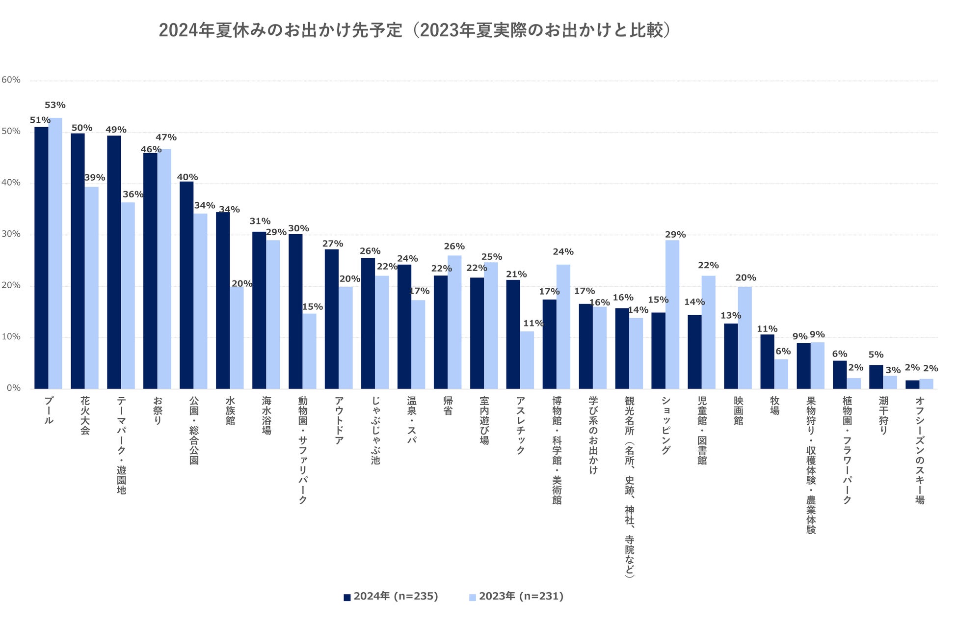 最も多かったのは「プール(51%)」で、つぎに「花火大会(50%)」が続き、夏ならではのお出かけ先が人気上位となりました。