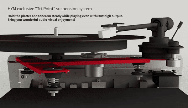 2年間に渡る開発期間を経て実現したHYMの画期的な3点サスペンションシステムは、トーンアームとプラッターをしっかりと支えながらもスピーカーから伝わる振動を減衰。