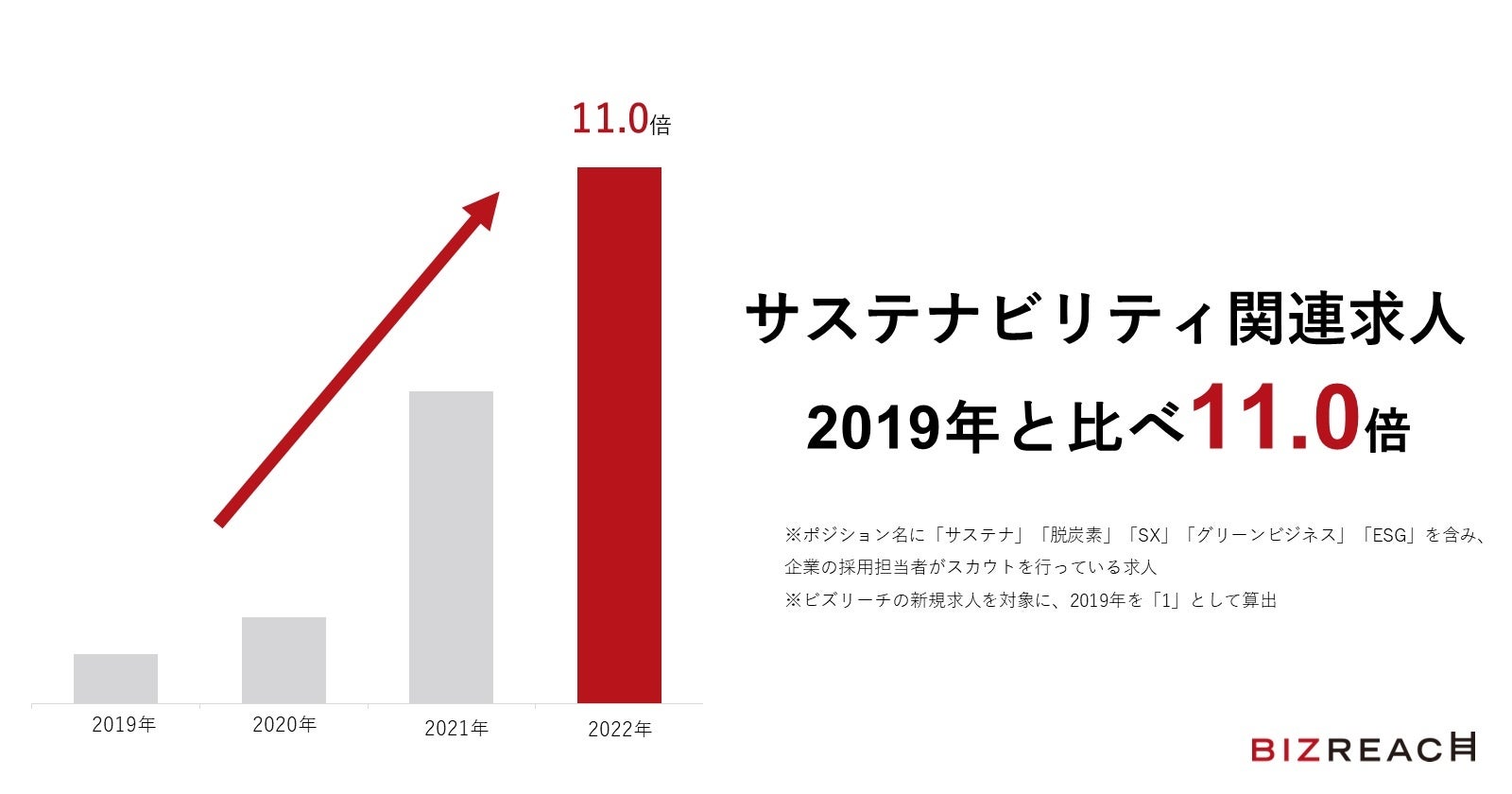 前年の1位は「DX」でしたが、2022年はさまざまな分野で具体的にDXが進んだことで、DXを深化させる人材の需要が高まった1年となりました。また4位「カーボンニュートラル」、14位「電池」がランクインしたように、ビズリーチ上の「サステナビリティ関連求人」は年々増加傾向で、政府の「2050年カーボンニュートラル宣言」前の2019年と比べて2022年の求人数は11.0倍に伸長していることが分かりました。