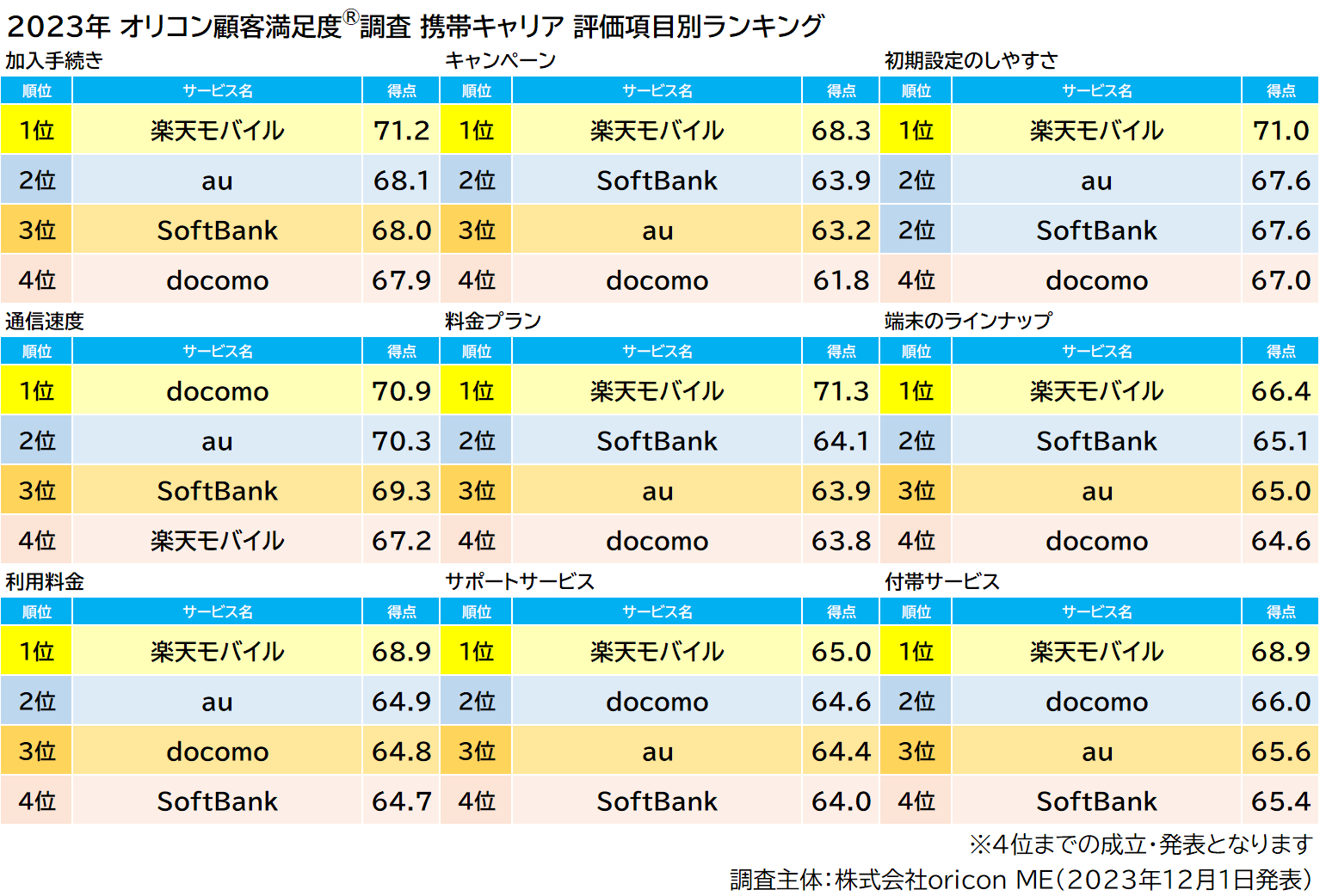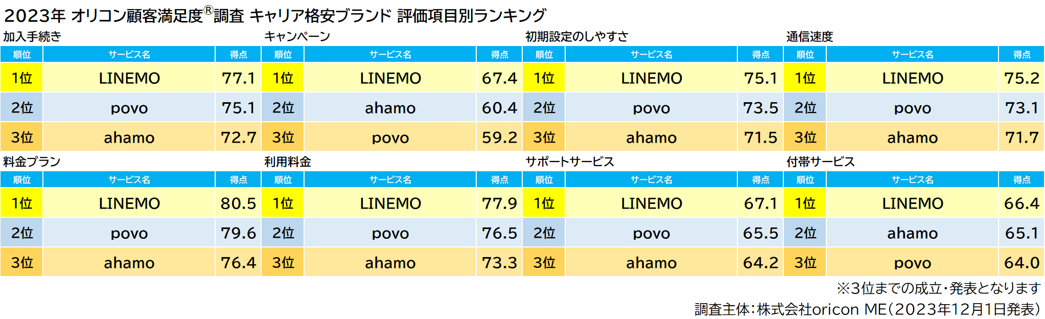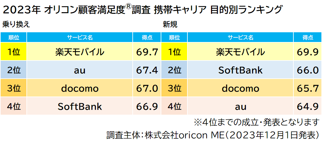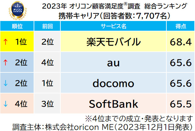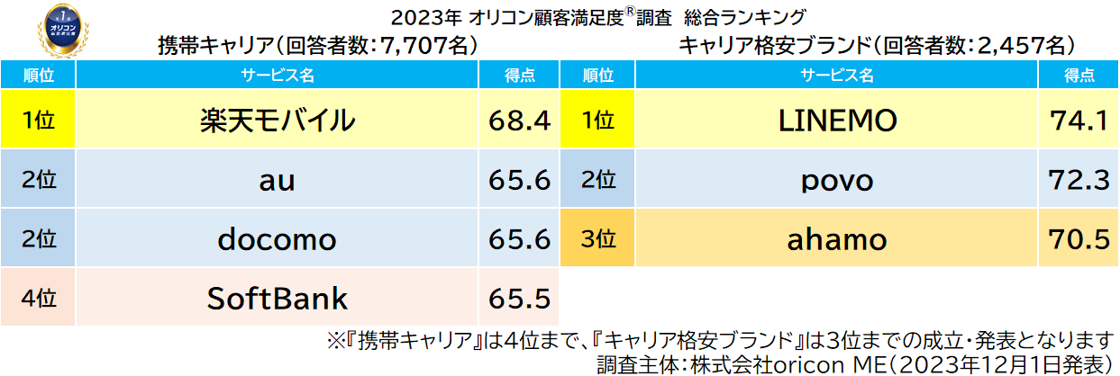 2023年 満足度の高い『携帯キャリア』『キャリア格安ブランド』ランキング|【楽天モバイル】【LINEMO】が総合1位、「通信速度」は【docomo】が3年連続1位(オリコン顧客満足度調査)