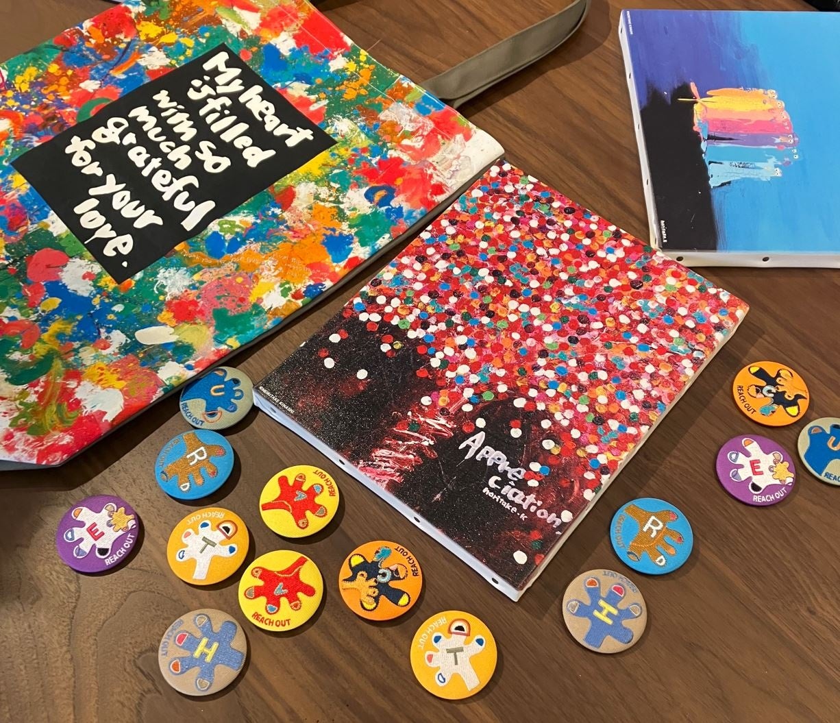 「手を差し伸べる、人々と触れ合う」という意味を持つREACH OUT。マジックから木材まで幅広い素材を使い、様々な色や形の手をモチーフとして描きます。このシリーズには、仲間と友人との繋がりや助け合いというメッセージが込められています。