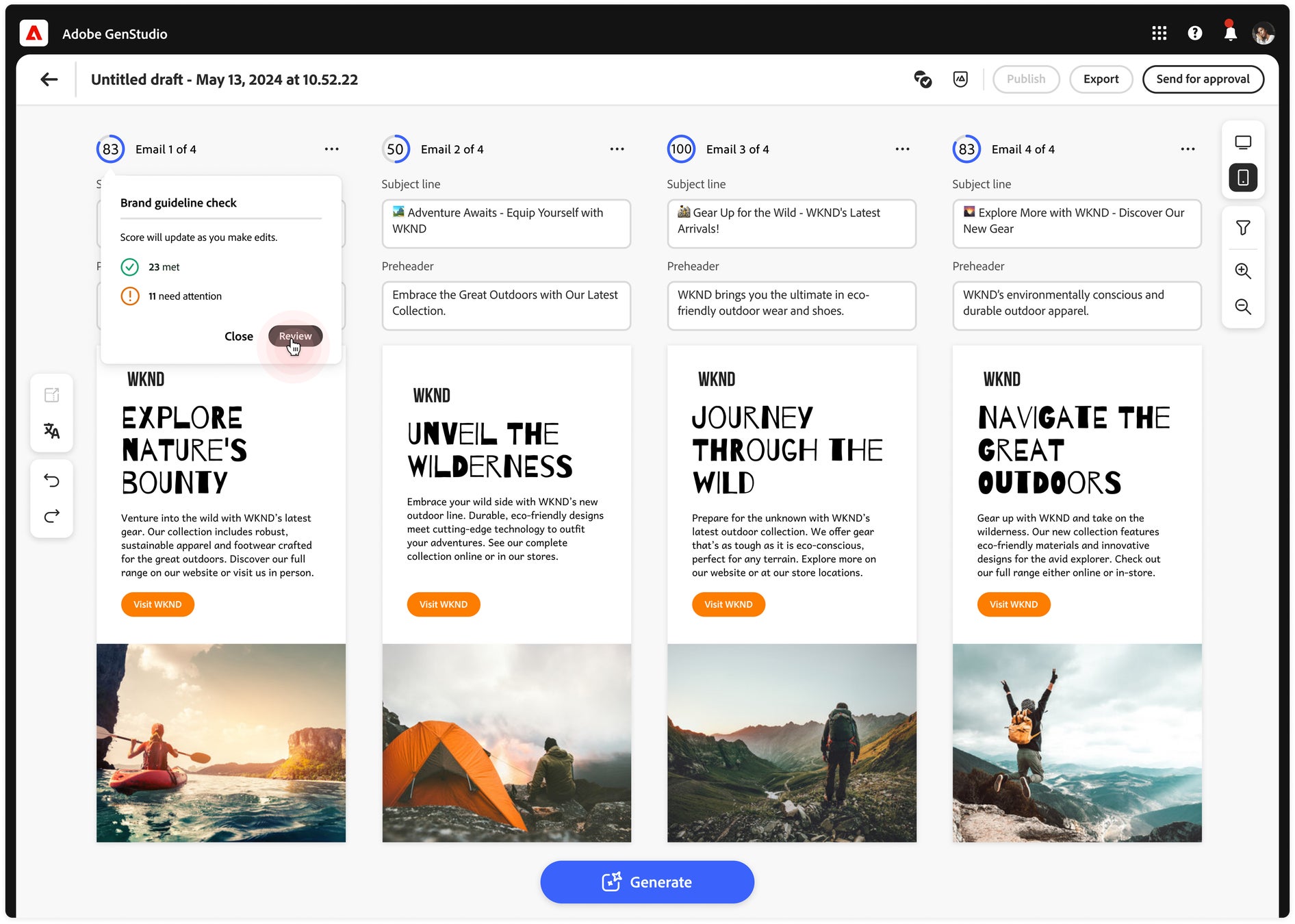 ブランドエクイティの保護:ブランドの構築と定義には毎年数百万ドルが投資されています。 生成AIがコンテンツ制作プロセスを再定義する中、企業には強固なガードレールが必要です。企業はブランドガイドライン(フォント、トーン、チャネル要件)を、あらかじめ定義されたテンプレートとともに、新しいアプリケーションに簡単にアップロードして標準化することができます。AIによるブランドチェック機能は、生成されたコンテンツを自動的に確認し、ブランドのコンプライアンスに違反しているかもしれないコンテンツに注意する必要があることをクリエイティブチームやマーケティングチームに警告します。Adobe Workfrontとのネイティブ統合により実現した、自動化されたマルチステップのレビューワークフローは、コンテンツが外部に配信される前に、さらなる監視のレイヤーを提供します。