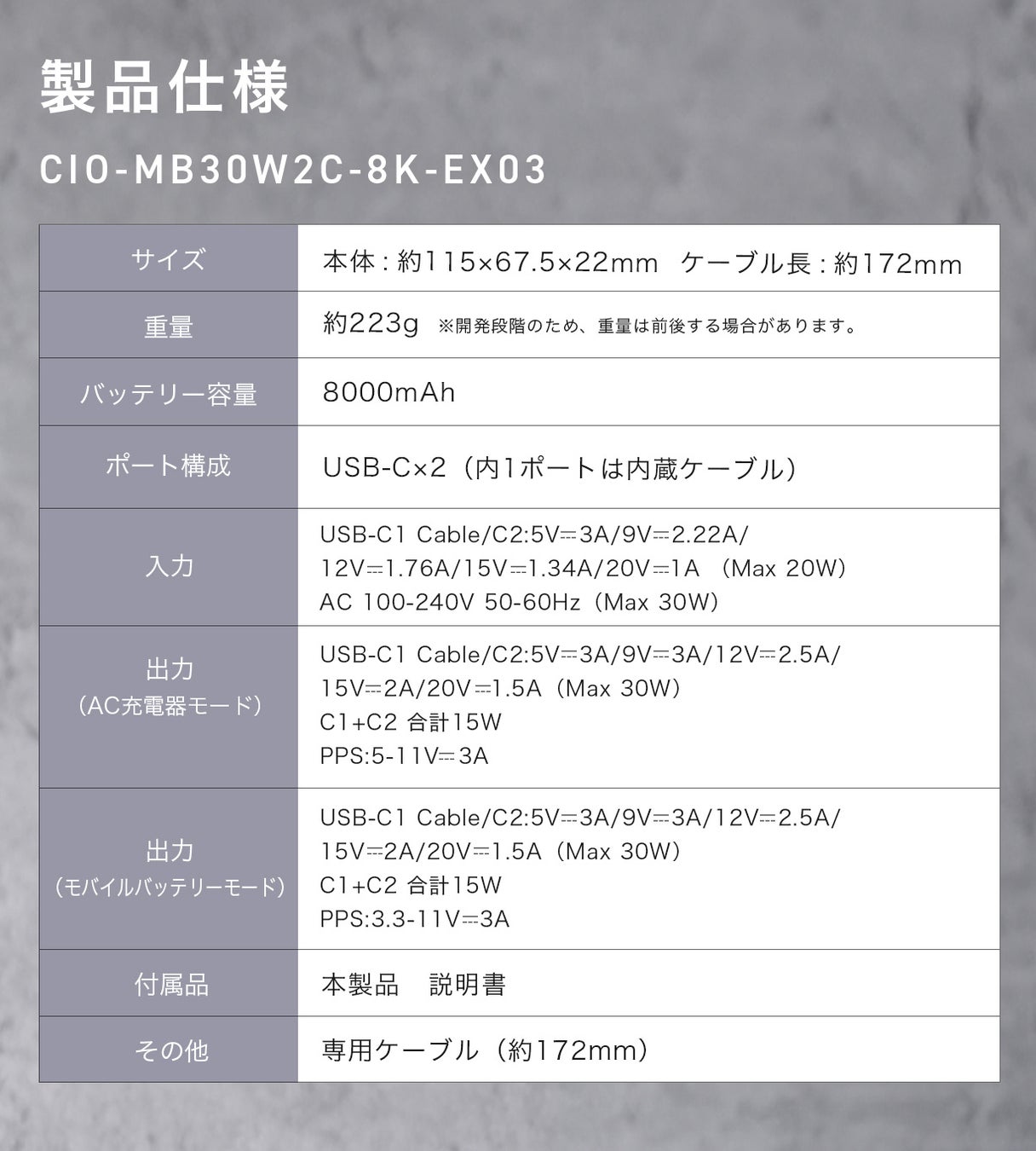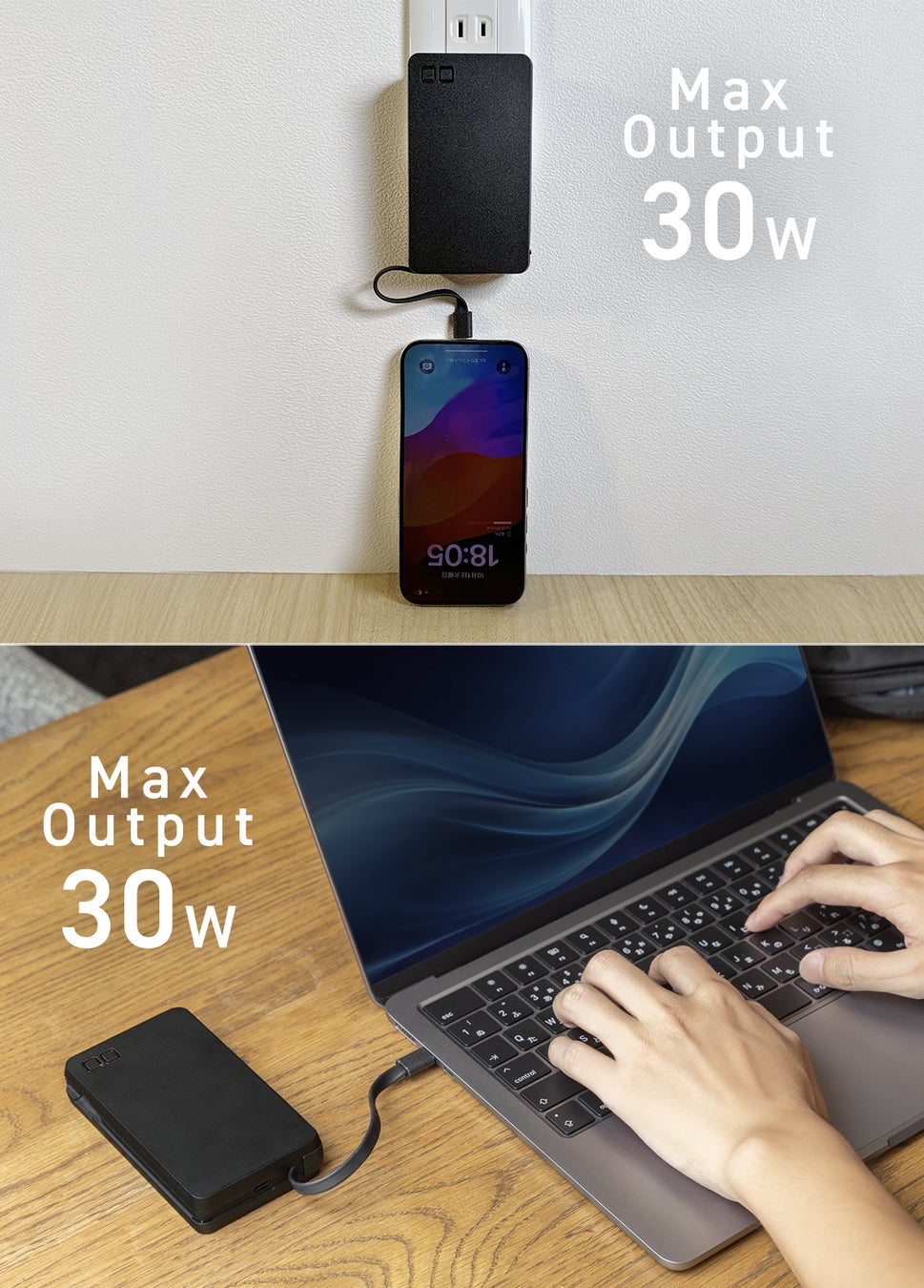 最大出力はAC充電器・モバイルバッテリーどちらでも30Wに対応。