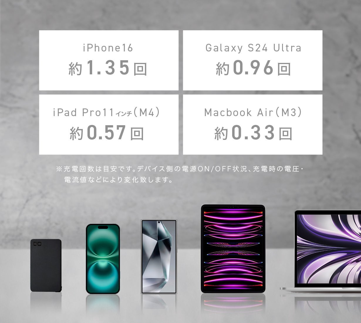 パワフルさを活かしながら、重量やコストバランスに優れた製品で、様々なスマホを約1.3回、タブレットも約0.5回充電が可能です。
