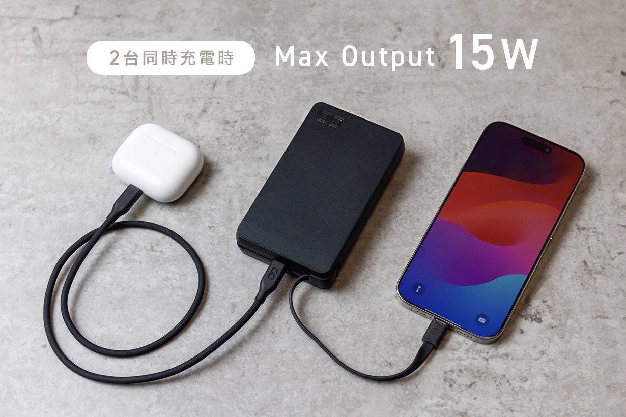 内蔵ケーブルとCポートを1つ搭載しているので、 2台のデバイスを同時に充電。 2ポート合計15Wの範囲で最適に充電することができます。(※AC充電器時・ モバイルバッテリー時共通)