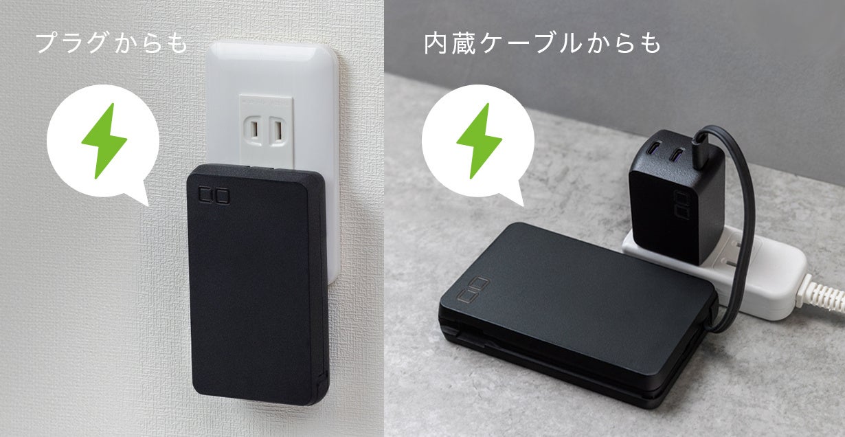 壁コンセントならACプラグ、電源タップなら内蔵ケーブルを他のAC充電器につなぐといった、利用シーンに合わせて、ACプラグか内蔵ケーブルを選んでご使用いただけます。※他Cポートから別途ケーブルを用いた入力も可能です。