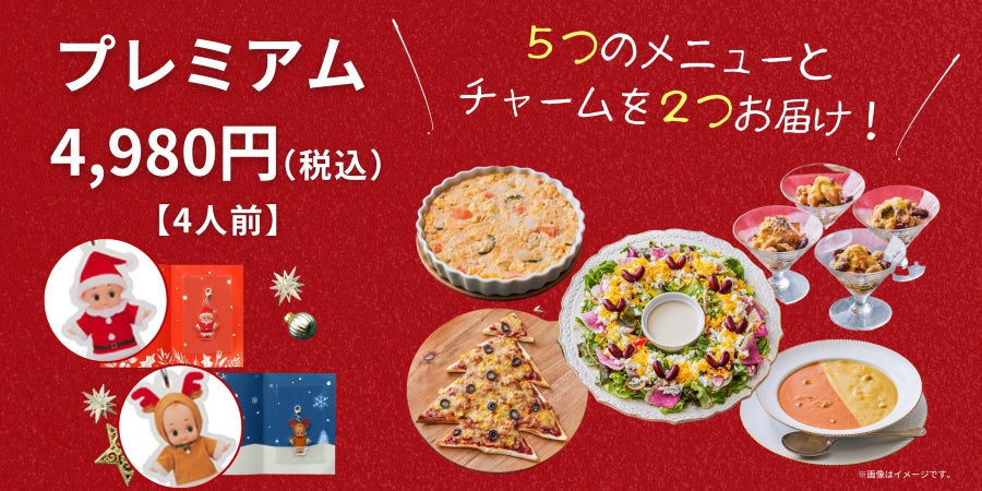 「Qummyクリスマスセット」は、クリスマスにぴったりな華やかなサイドメニューが簡単に作れるセットです。5つのメニューが作れる「プレミアムセット」(税込:4,980円)と4つのメニューの「ベーシックセット」(税込:3,980円)の2種類を用意しました。セットを使用したレシピカードも一緒にお届けします。クリスマスセット限定のキユーピーオリジナルチャーム付きです。いずれのセットも送料は無料です。
