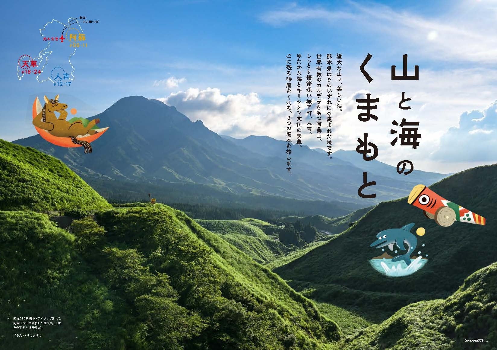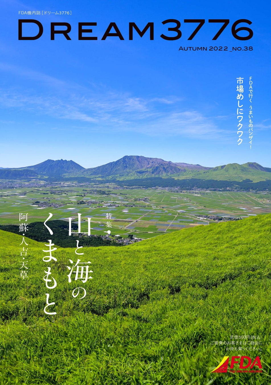 今回の機内誌「DREAM3776 ”2022年秋号”」では、雄大な山々、美しい海をあわせもつ熊本県を特集しています。「人と自然の調和が美しい阿蘇」、「球磨の山里の城下町・人吉」、「青く輝く海とキリシタン文化の天草の山と海」、それぞれ独特の文化が育まれてきた3つの熊本を巡りながら、心がリラックスする旅の楽しみ方を紹介します。FDA便にご搭乗の際は、同機内誌をお楽しみください。