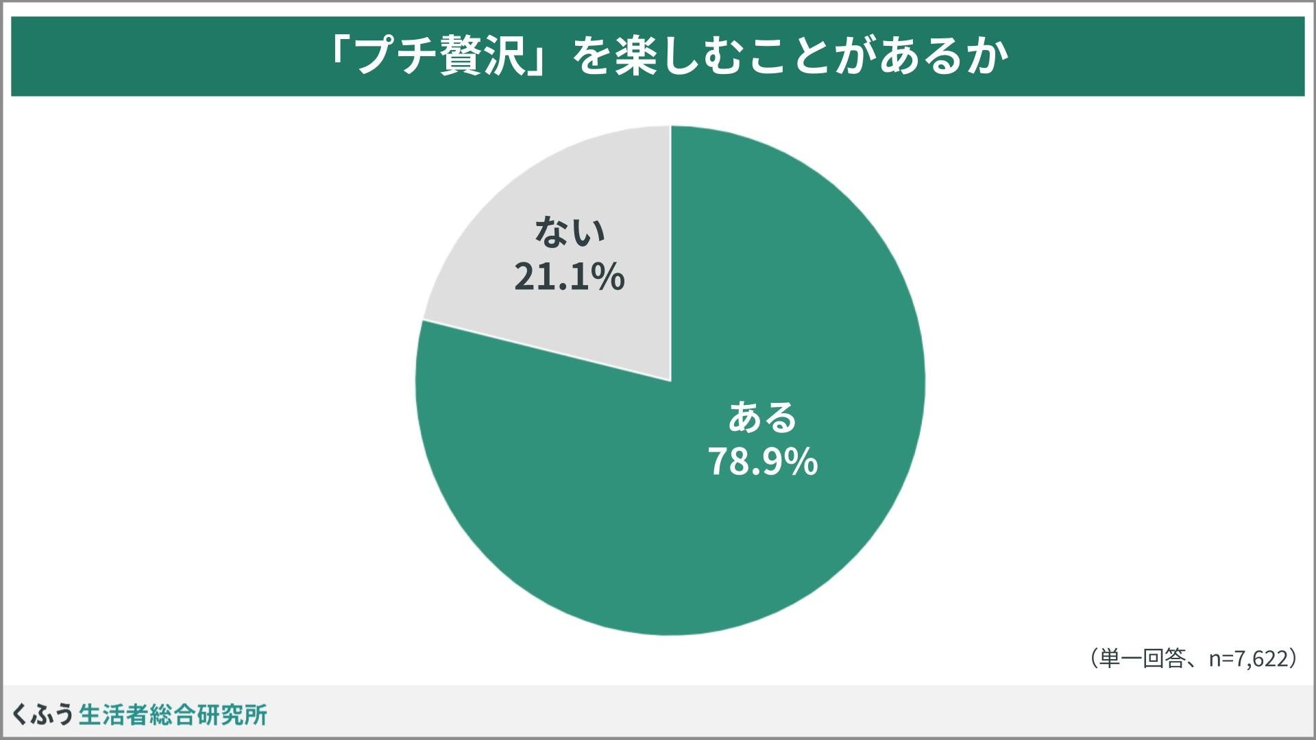 「プチ贅沢」を楽しんでいる人は78.9%。約8割の人が日々の暮らしの中で、自分へのささやかなごほうびを取り入れています。