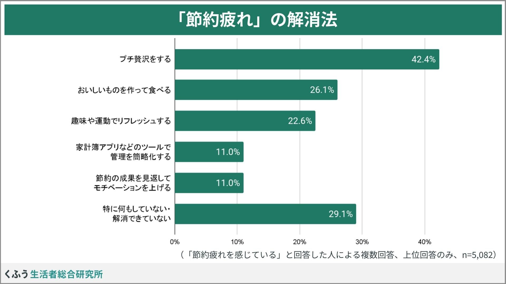 節約によるストレスや負担感をどのように解消しているかたずねたところ、最も多かったのは自分へのささやかなごほうびにお金を使う「プチ贅沢をする」(42.4%)となりました。