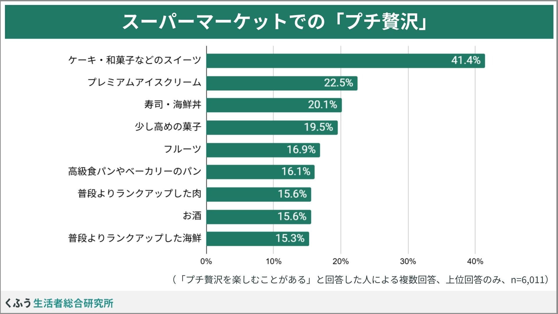 「食」に関する「プチ贅沢」を楽しむ人が多いことから、スーパーマーケットで「プチ贅沢」として購入する商品をたずねたところ、「ケーキ・和菓子」「プレミアムアイスクリーム」「少し高めの菓子」など「スイーツ・菓子」類が上位を占める中、3位に「寿司・海鮮丼」(20.1%)がランクインしました。外食で寿司を食べるよりも安価で手軽に楽しめることで、ささやかな贅沢として取り入れている人が多いようです。パンや肉、海鮮などを普段よりランクアップして楽しむという人も一定層いました。