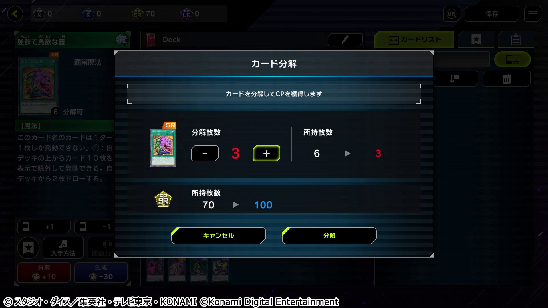 所持しているカードを分解すると分解したカードと同等のレアリティの「CP」を獲得でき、集めた「CP」を消費して新たなカードの生成が可能です。