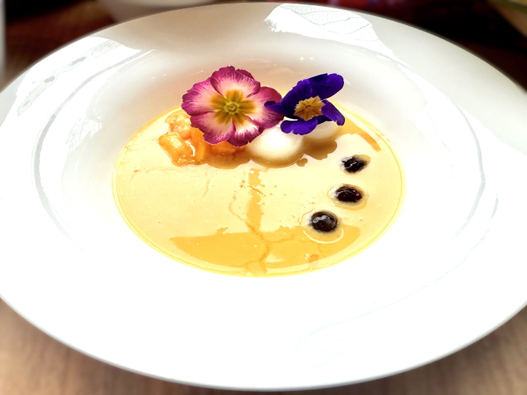黄色いスープにアクセントとして、白玉やタピオカなどをお好みでトッピングいただけます。