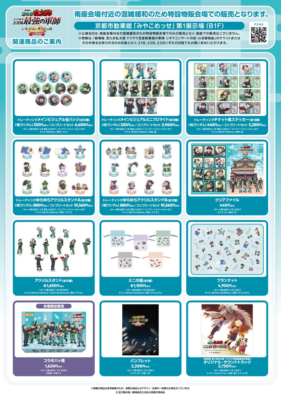 ※物販は、「劇場版 忍たま乱太郎 ドクタケ忍者隊最強の軍師 シネマコンサートの段 in京都南座」のチケットまたはその半券をお持ちの方のみ対象となり、入場時にチケットを確認いたします。(スマチケをご利用の方は、物販購入券をご提示ください。)