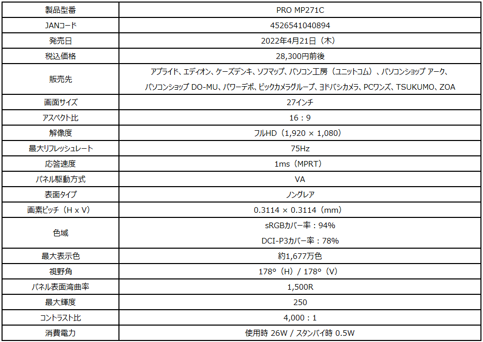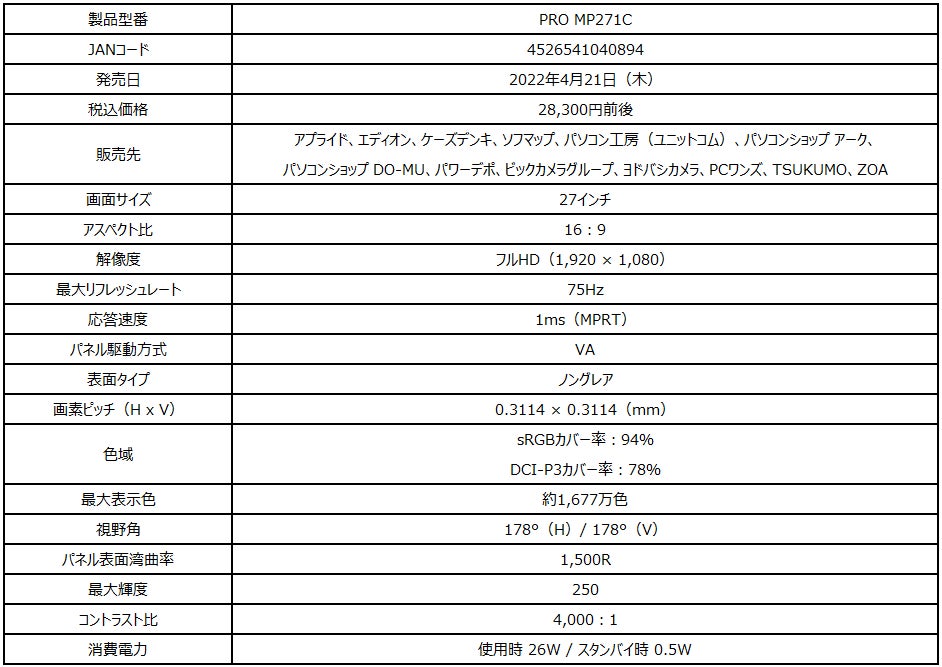 製品ページ: https://jp.msi.com/Business-Productivity-Monitor/PRO-MP271C
