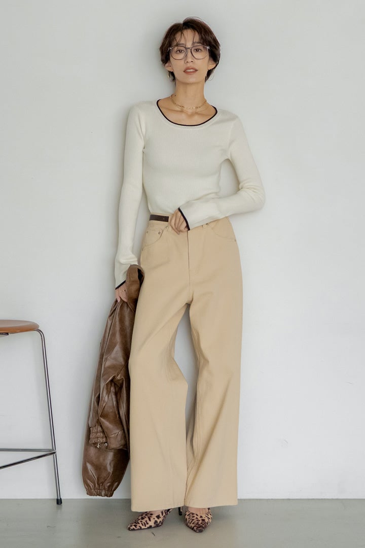 フレア袖が印象的なリブニットは、黒の配色で全体をきりっと引き締めて。