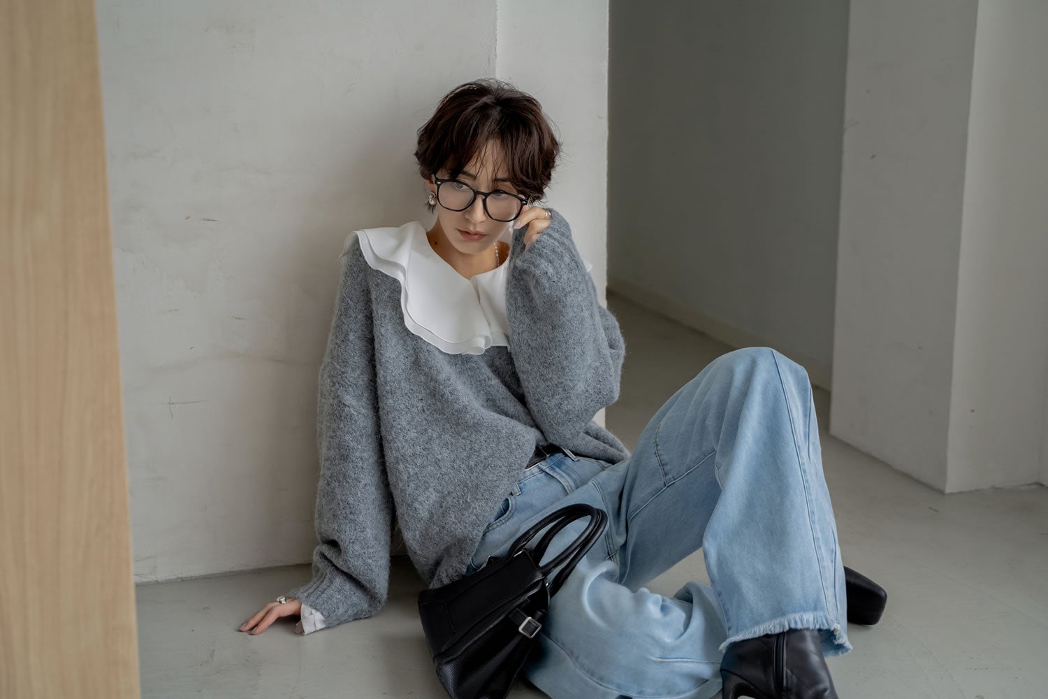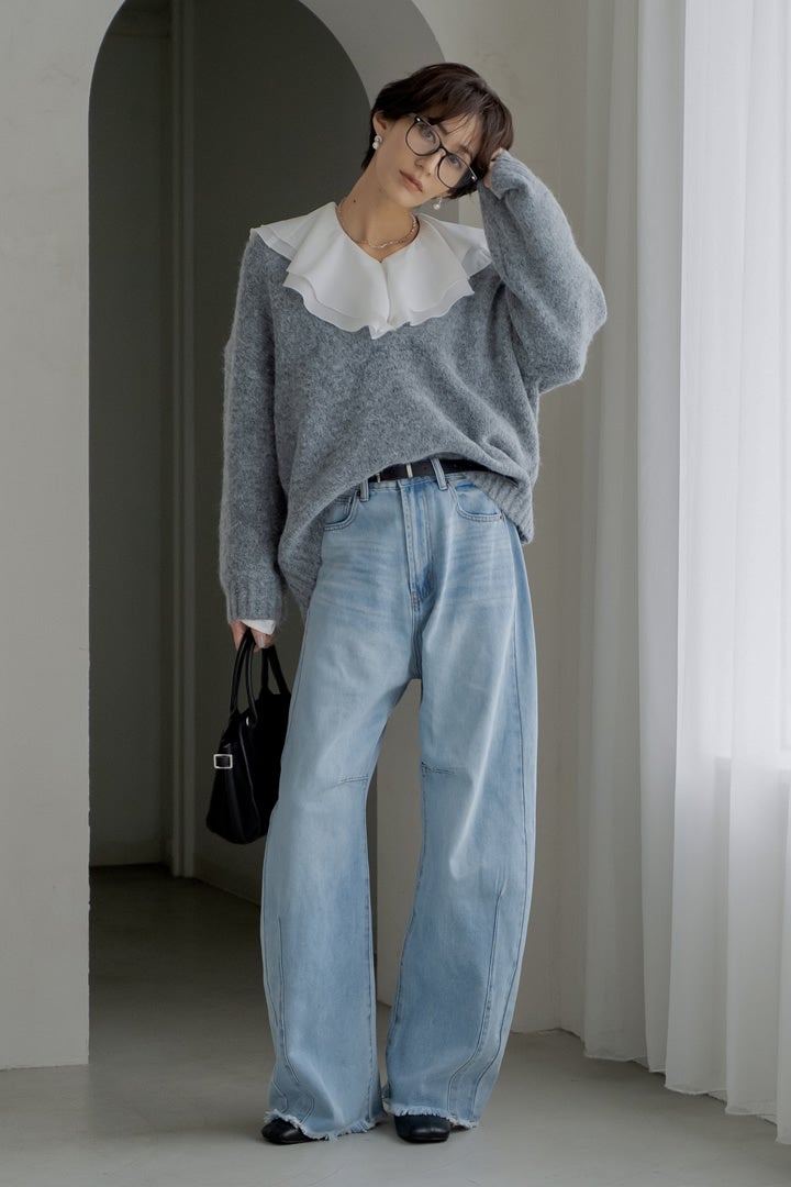 ラッフルカラーが映える、品よくモードなデニムスタイル