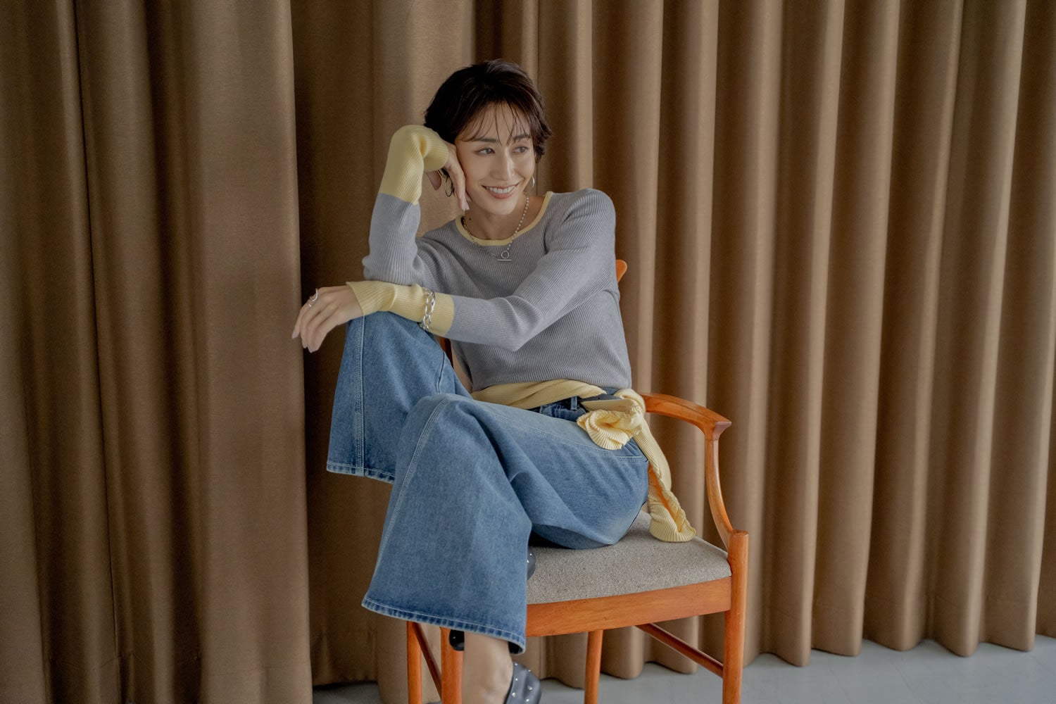 柔らかなイエローにグレーを重ねれば、品よく洒落た配色バランスに。