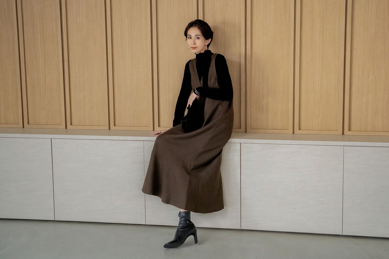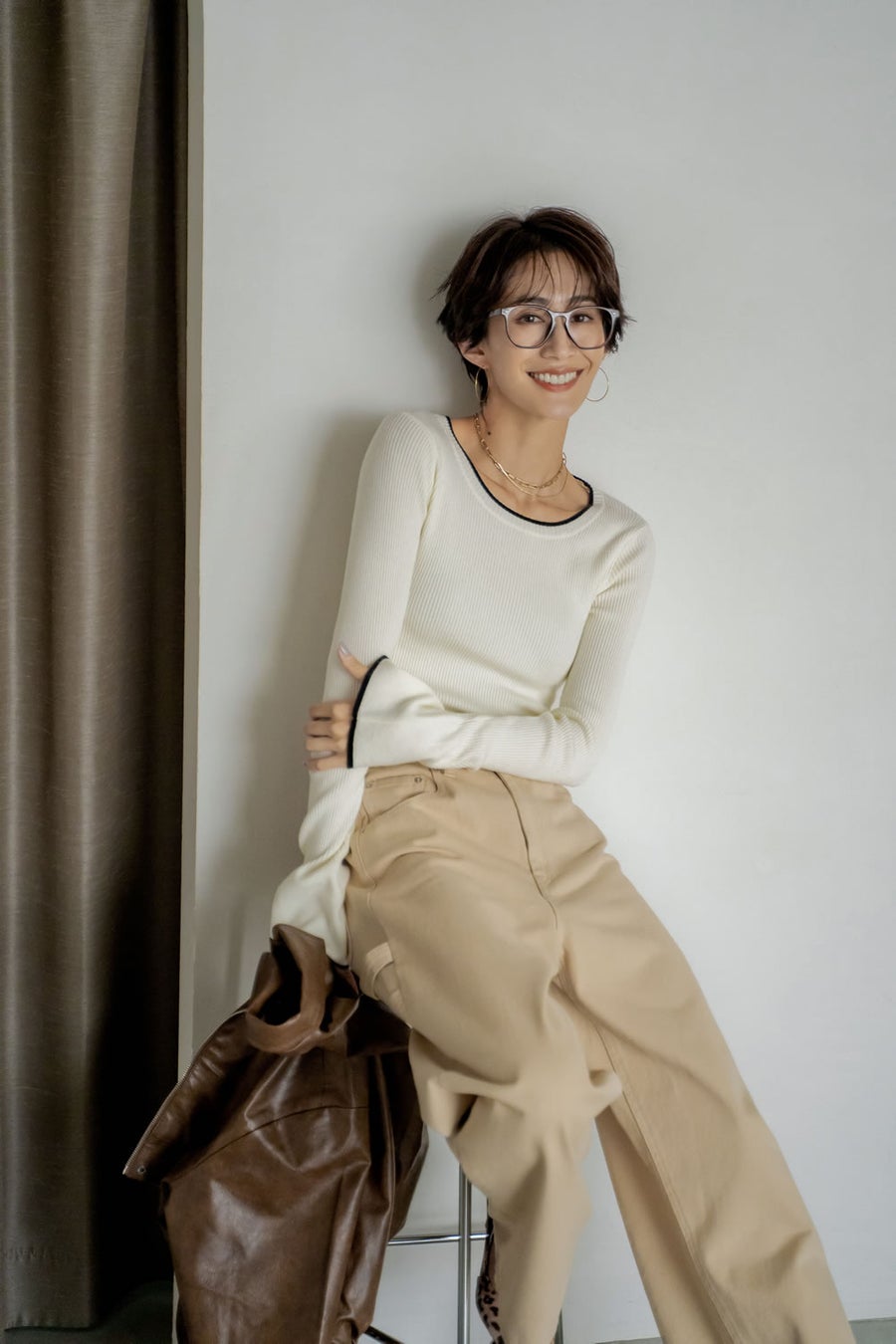 小物やアウターをブラウントーンでまとめて、秋らしい深みをプラス。