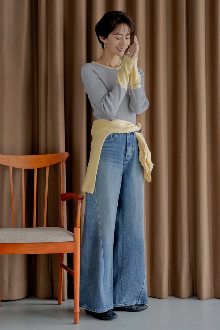 腰巻きニットを添えて、抜け感のある大人のデニムスタイルに仕上げて。