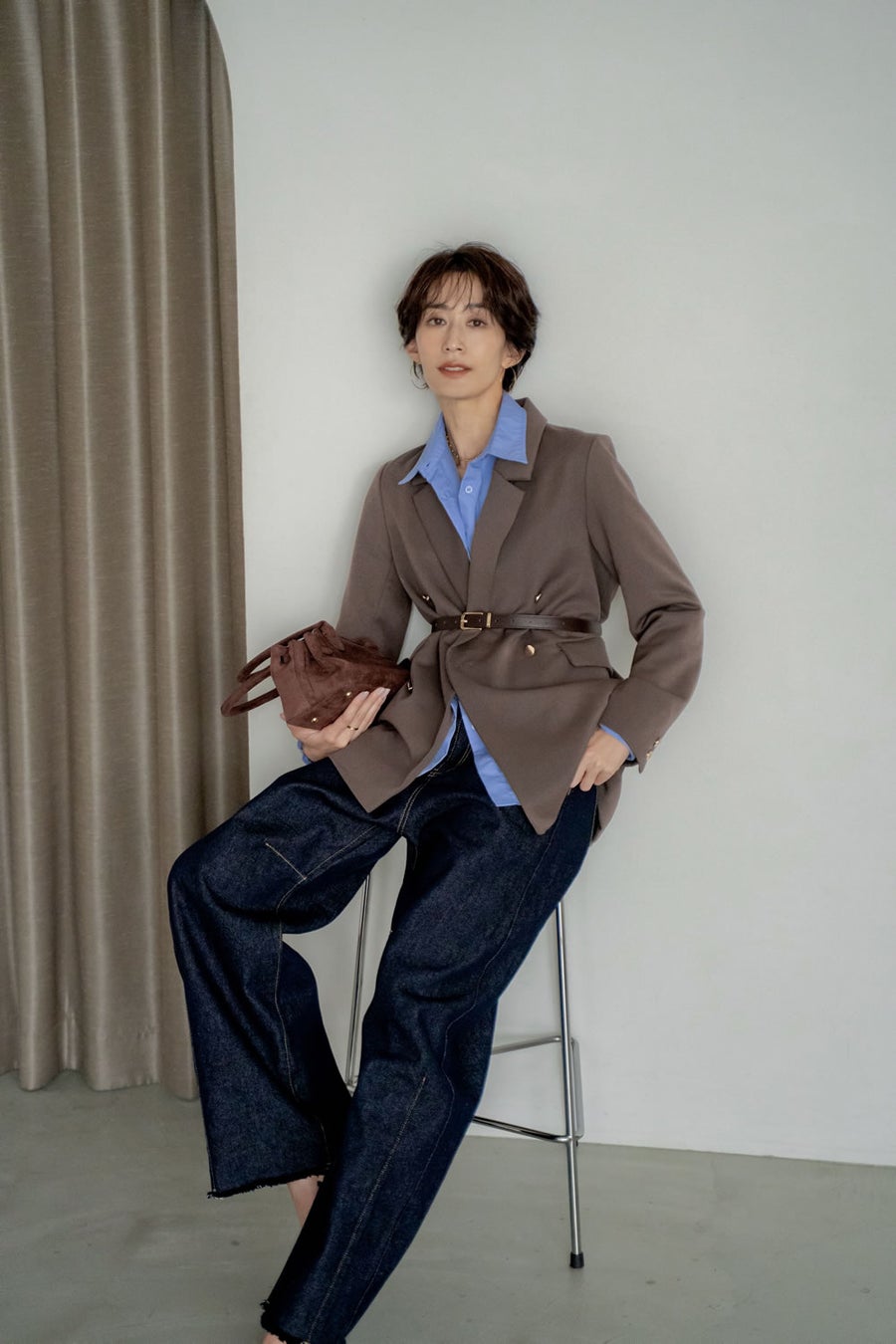 ブルー×ブラウンの配色が顔まわりを明るく見せ、程よい抜け感を演出。