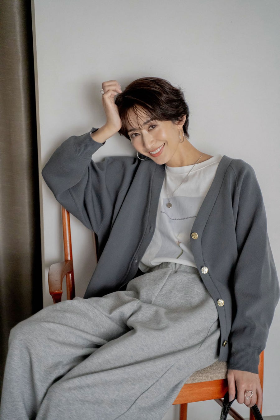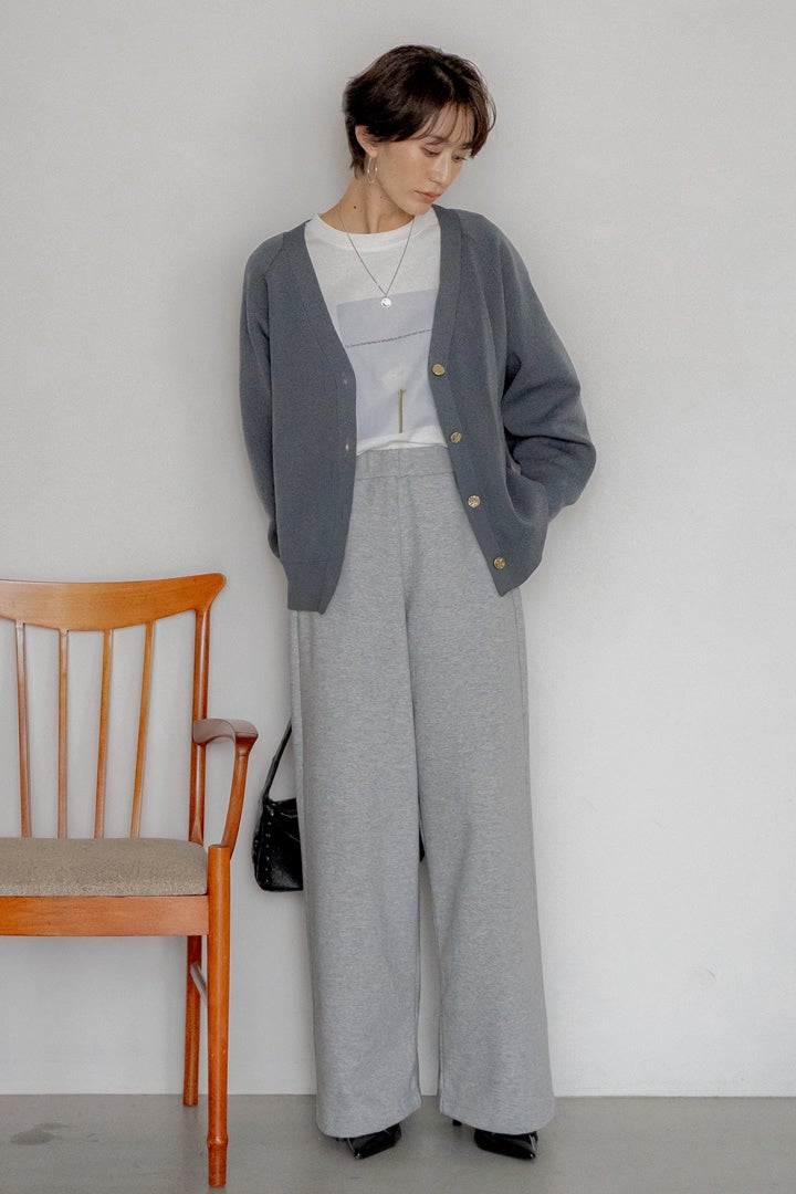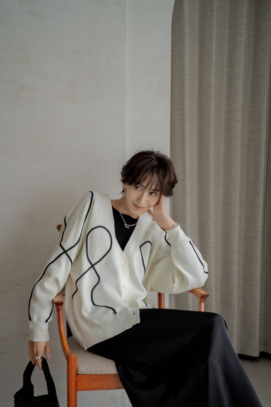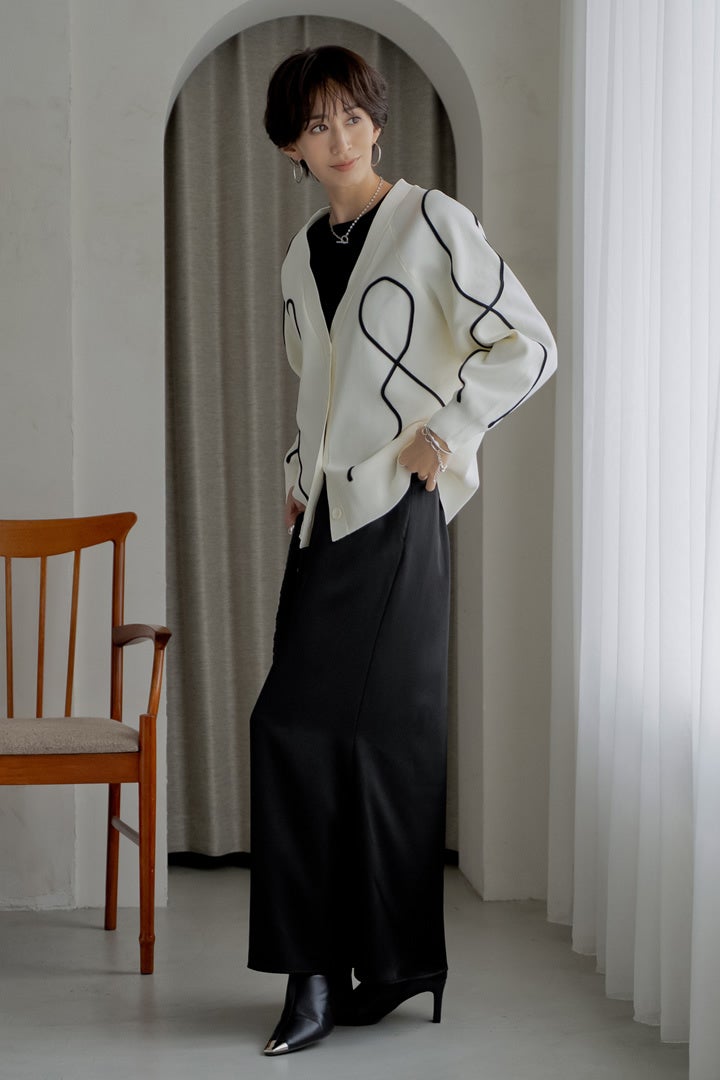 ジャケットライクなカーディガンを重ねて、モードな抜け感をプラス。