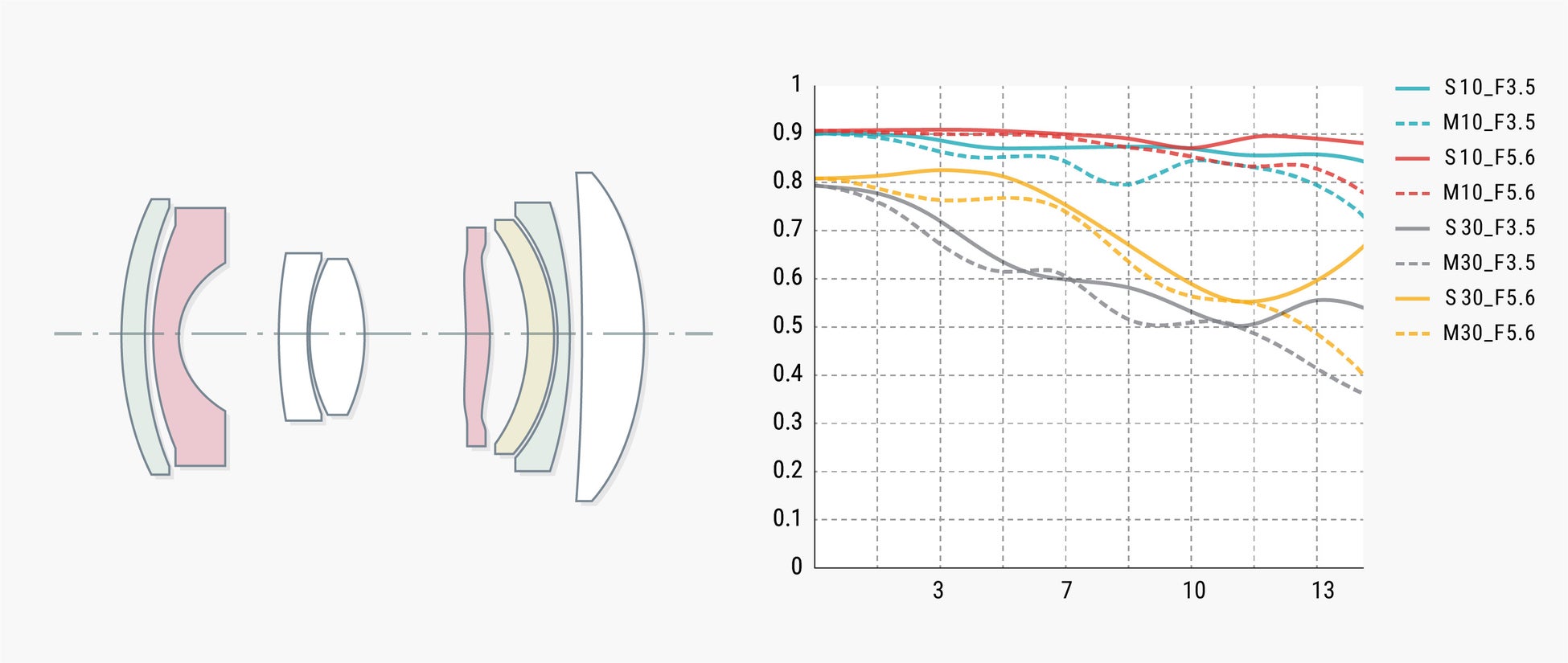 レンズ構成:7群8枚(ASPH非球面レンズ2枚、ED特殊低分散レンズ1枚、高屈折レンズ2枚)
