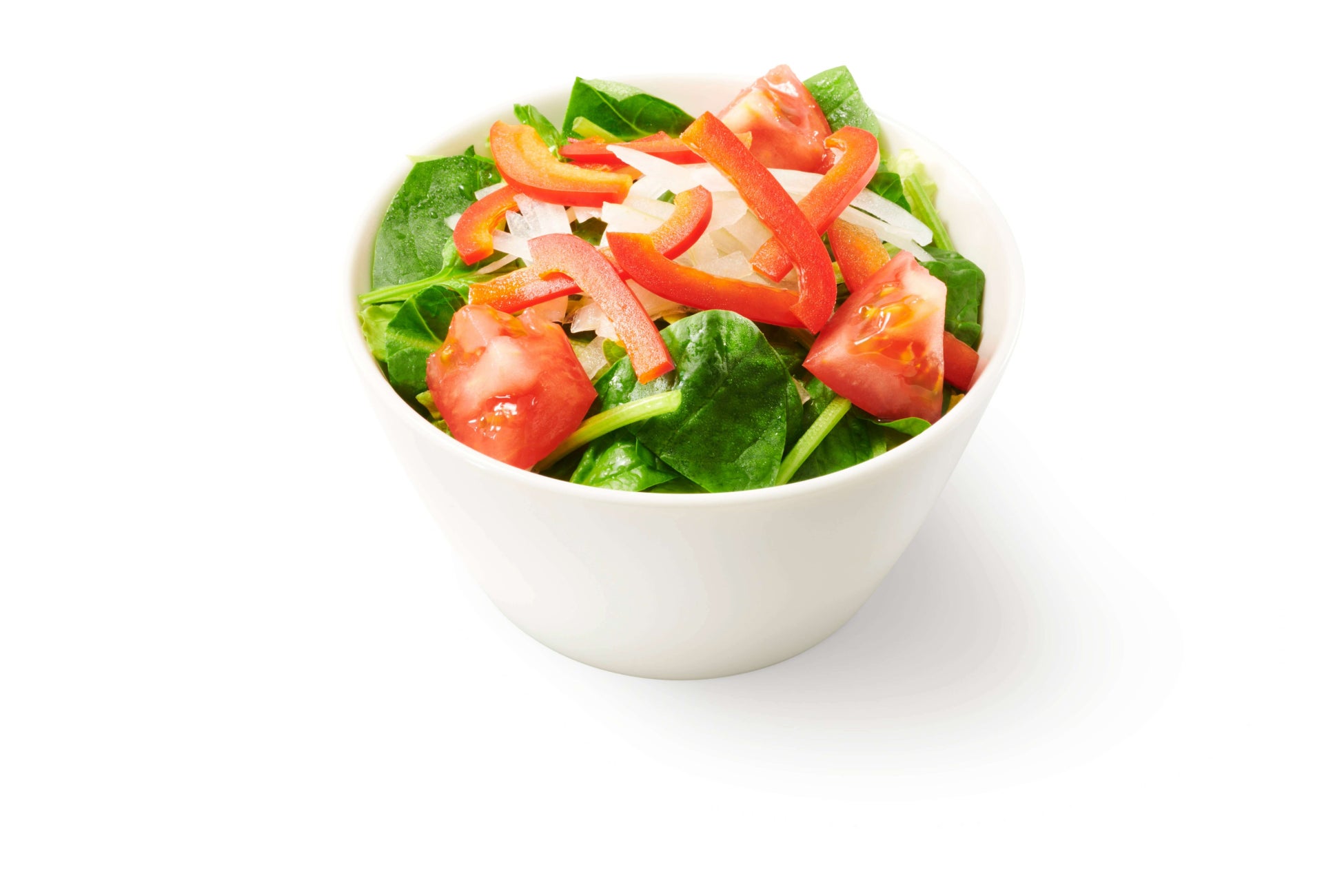 キャベツ、レタス、トマト、オニオン、赤パプリカ、サラダほうれん草を彩りよく重ねました。サラダほうれん草はサラダで食べられるように生産されており、アクや苦みが少ないため食べやすいのが特徴です。また、これからの夏の季節に旬を迎える赤パプリカを乗せ、健康志向の方にもおすすめな彩り豊かなサラダに仕上げました。ドレッシングは、醤油をベースにかつお節や昆布の旨みをきかせ、オニオンの風味を加えた減塩タイプ※1の和風ドレッシングです。