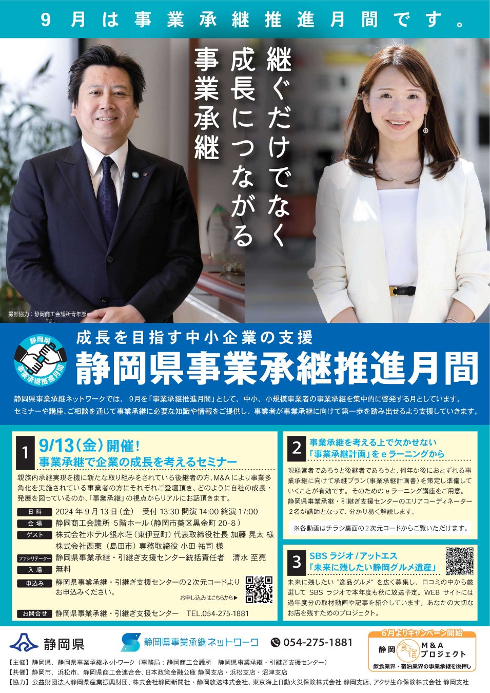 県は静岡県事業承継ネットワークと連携し、9月を「事業承継推進月間」として、中小企業者の事業承継の推進に向けた啓発活動を実施します。