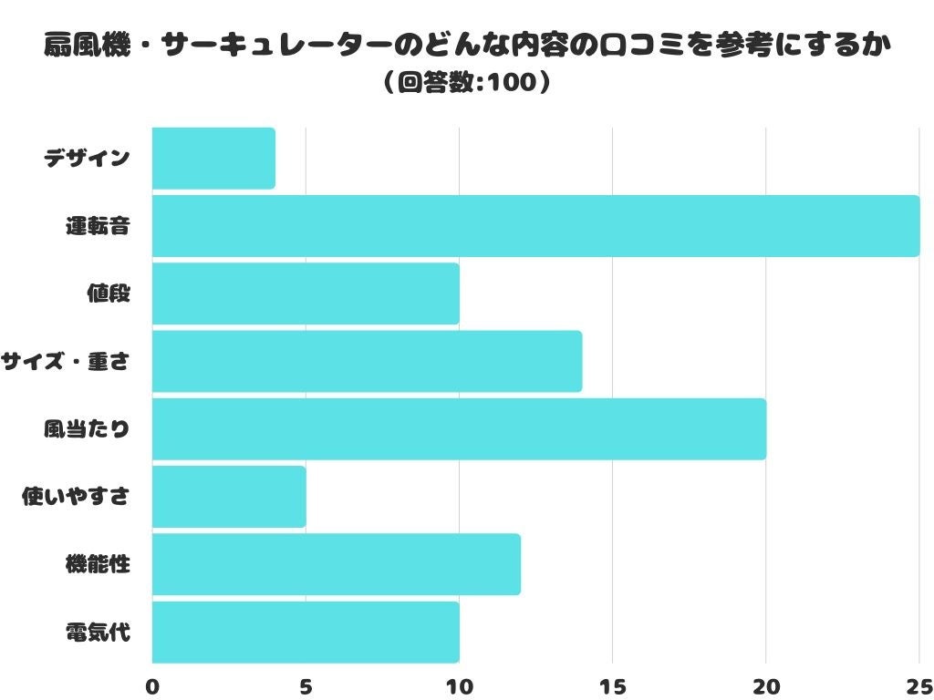 扇風機・サーキュレーターのどんな内容の口コミを参考にするかをアンケートにて調査したところ、1位は「運転音」でした。