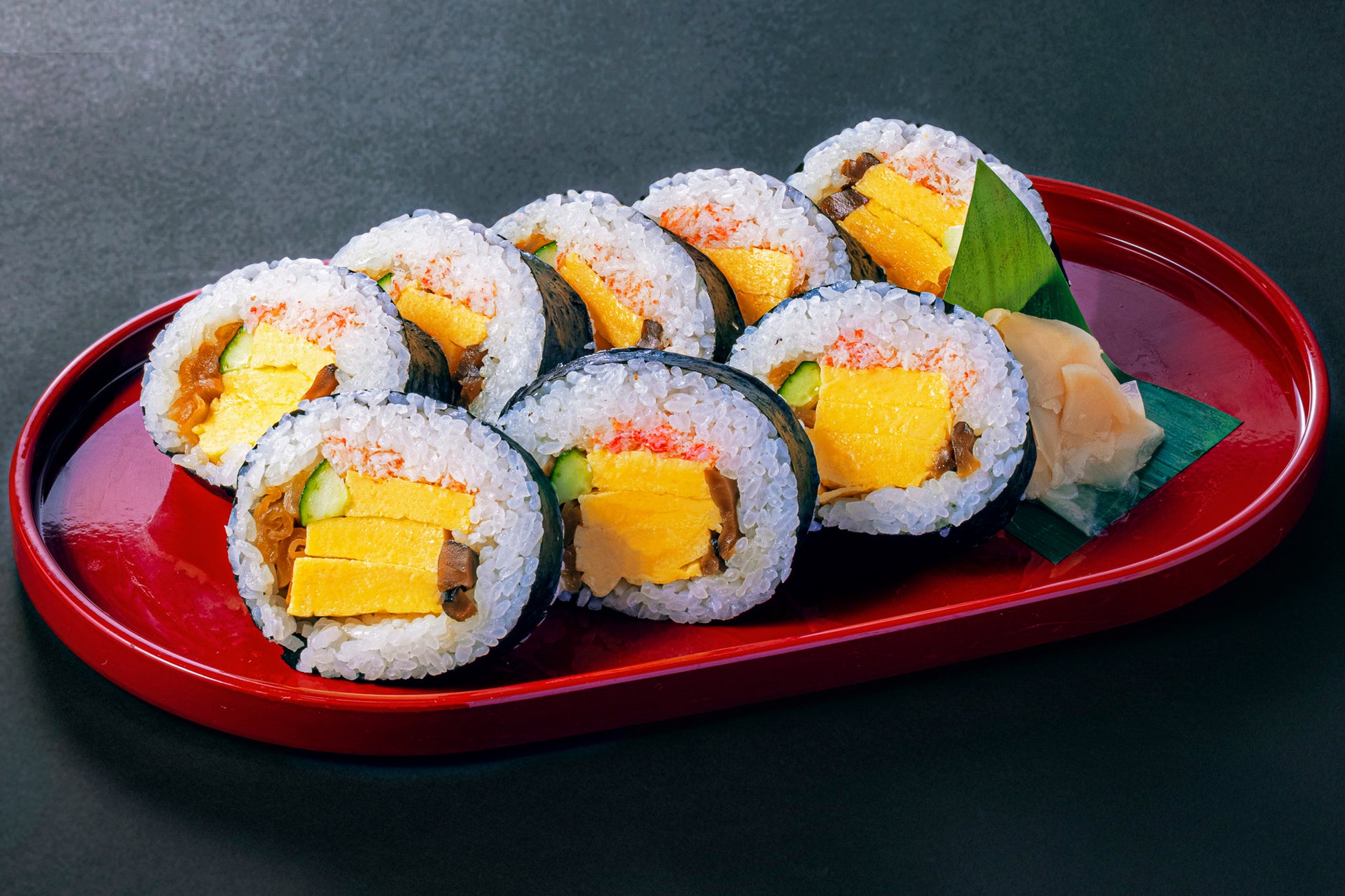 しっとり焼いたボリュームのある玉子焼きと蟹身や椎茸、胡瓜、かんぴょうを巻いた定番の太巻きです。