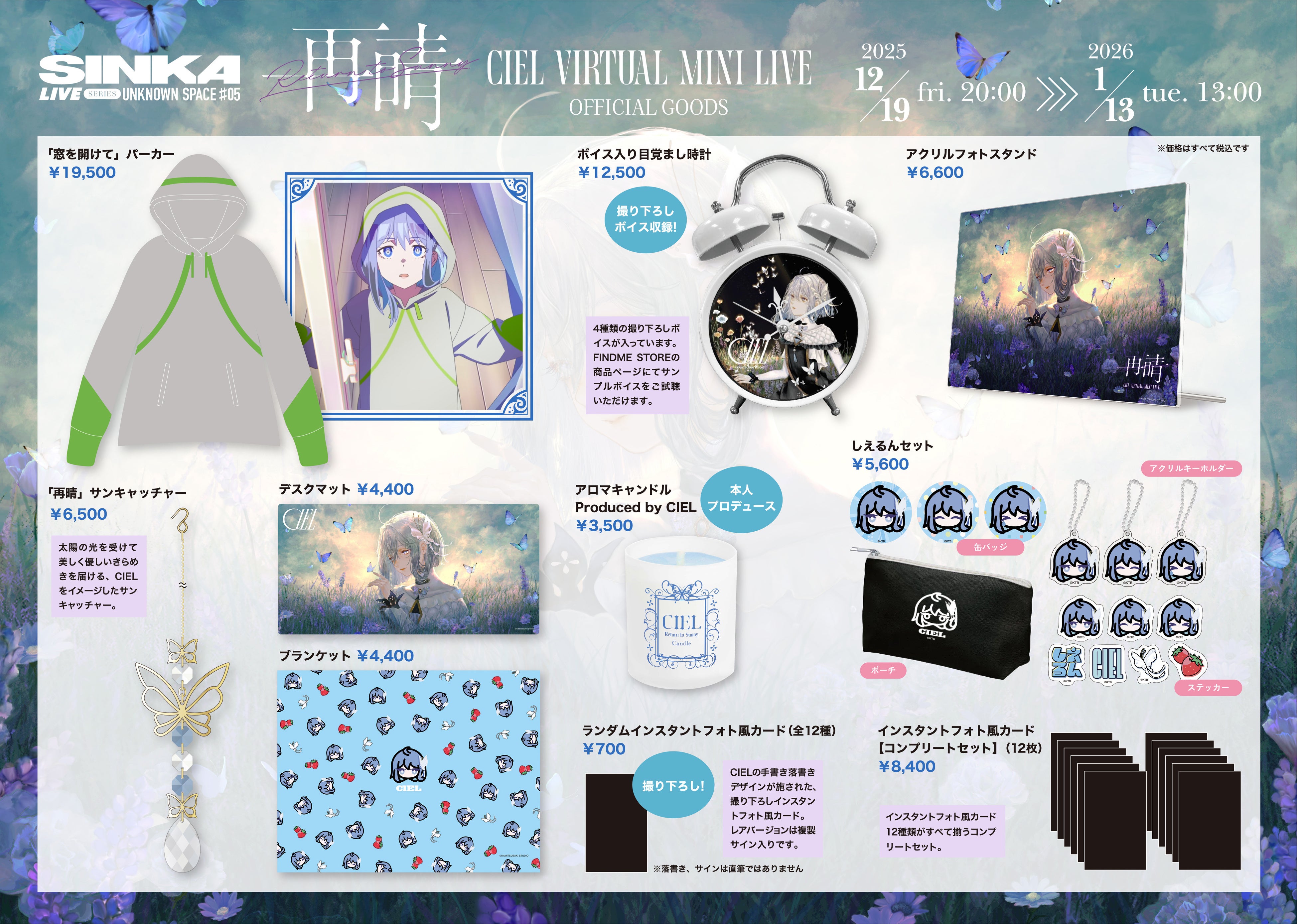 公演キービジュアルを使用したメモリアルなアクリルフォトスタンドや、楽曲をイメージしたアパレルアイテム、録り下ろしボイスを収録した目覚まし時計など、CIELの目覚め、そして再始動を象徴する特別なグッズがラインナップされています。