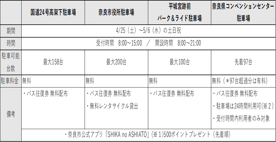 パーク&ライド駐車場にとめて、無料のバス往復券を利用して、快適に奈良公園へ行こう!