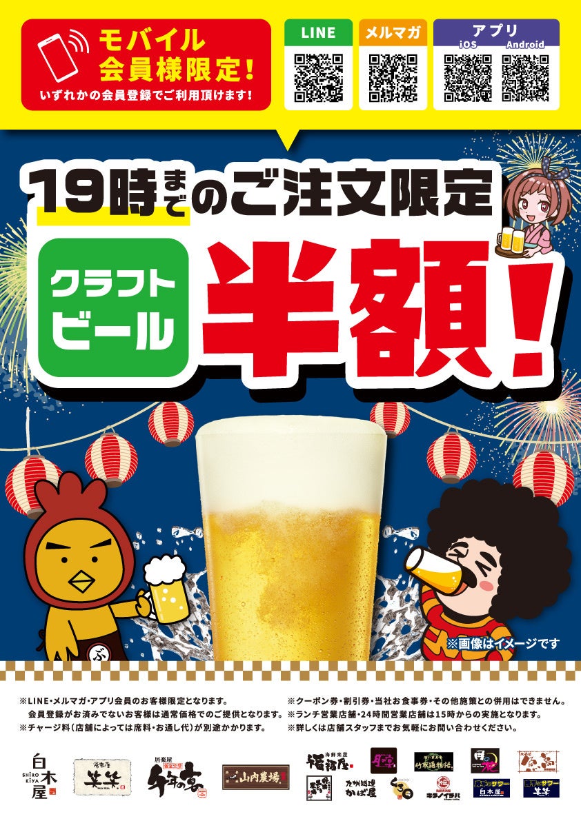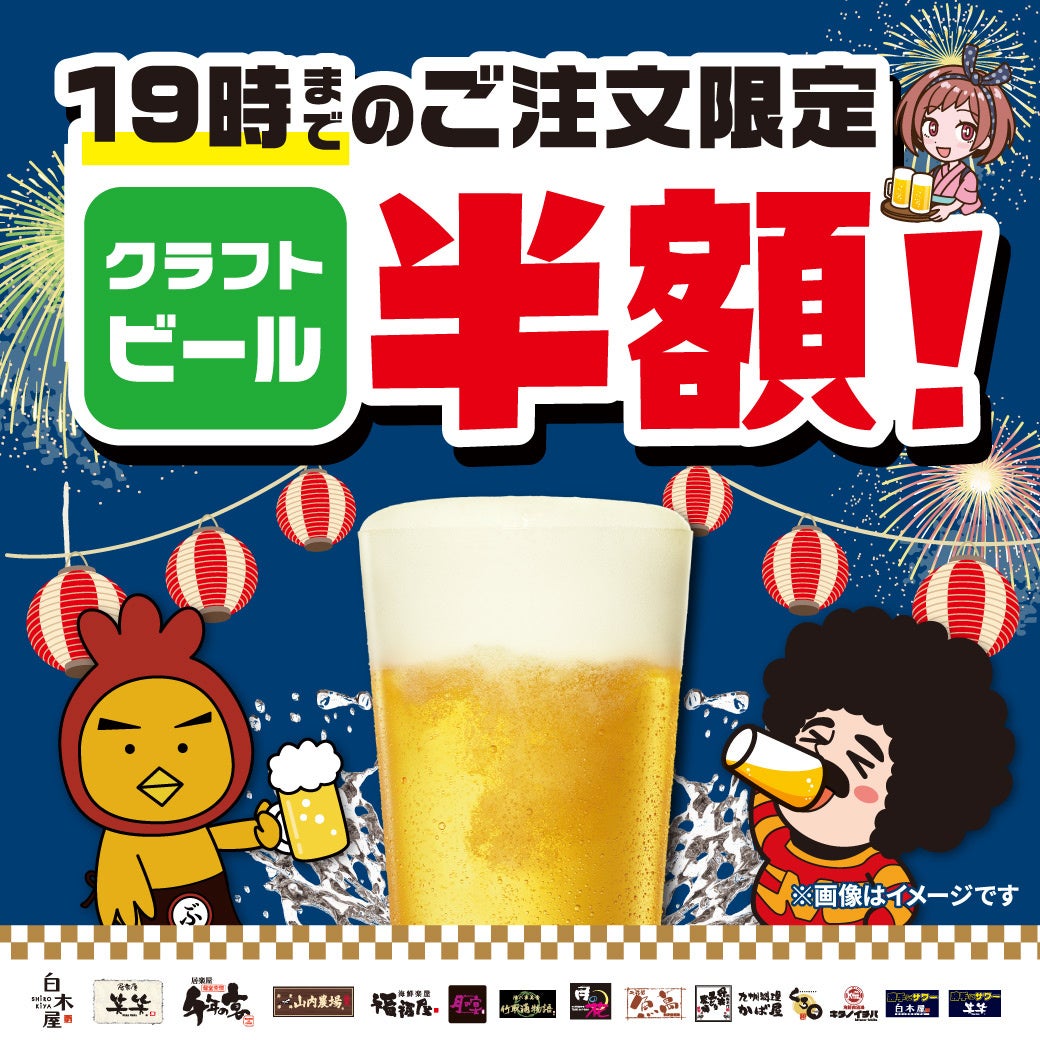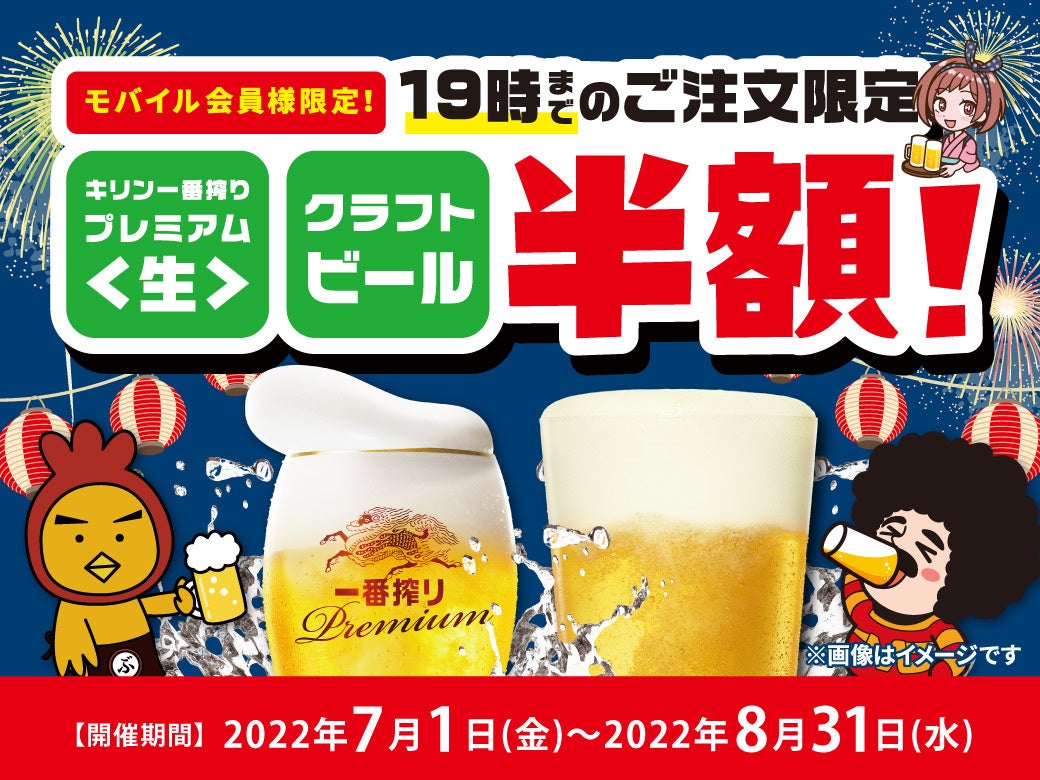 19時までのご注文で「クラフトビール」または「キリン一番搾りプレミアム(生)」が半額に!モバイル会員様限定セールを8月31日まで開催中です。