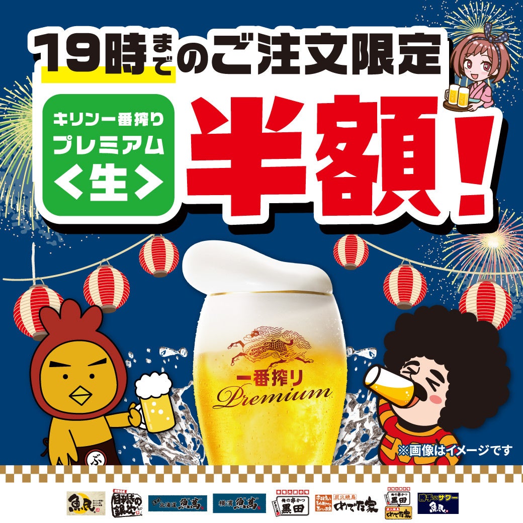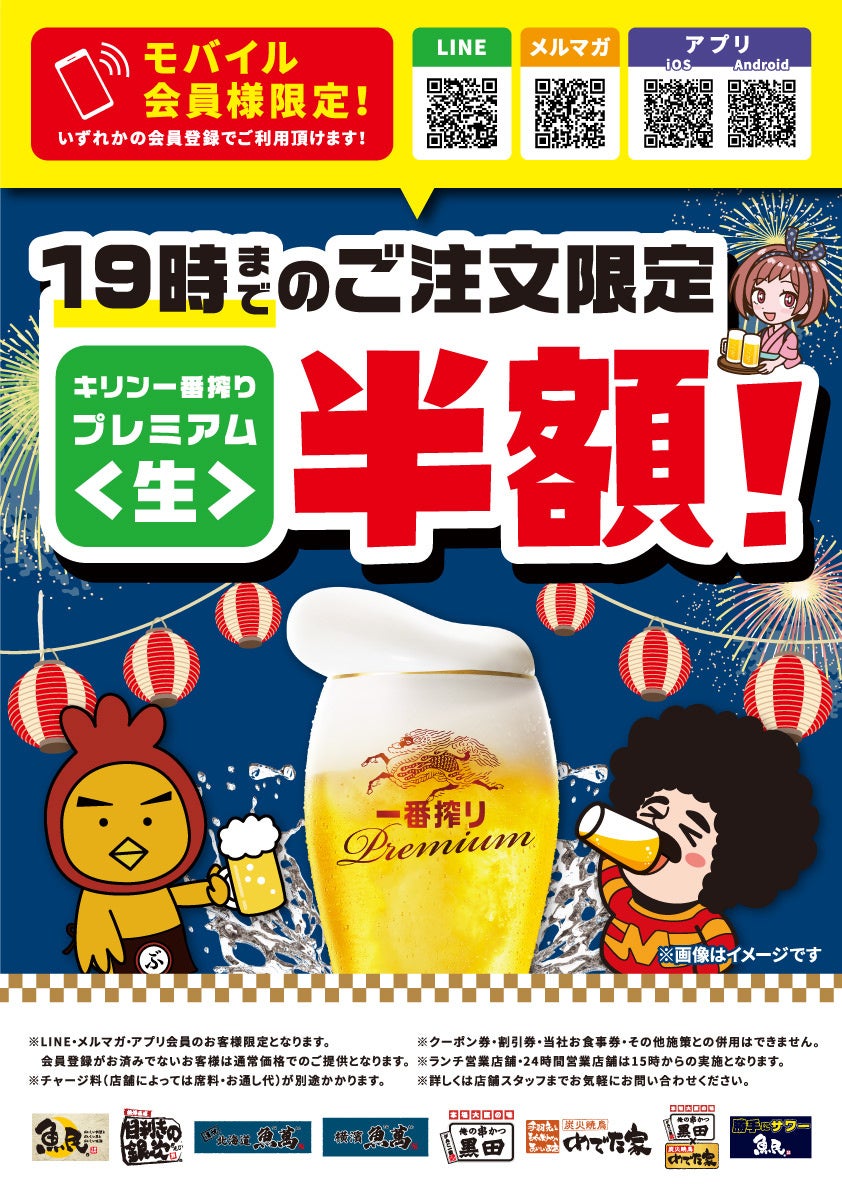 (※3)白木屋 横浜西口南幸店はセールを実施していません。また、福福屋 湘南台西口駅前店、千年の宴 ウエストコート姪浜店はクラフトビールの取り扱いがないため、キリン一番搾りプレミアム(生)半額セールとなります。