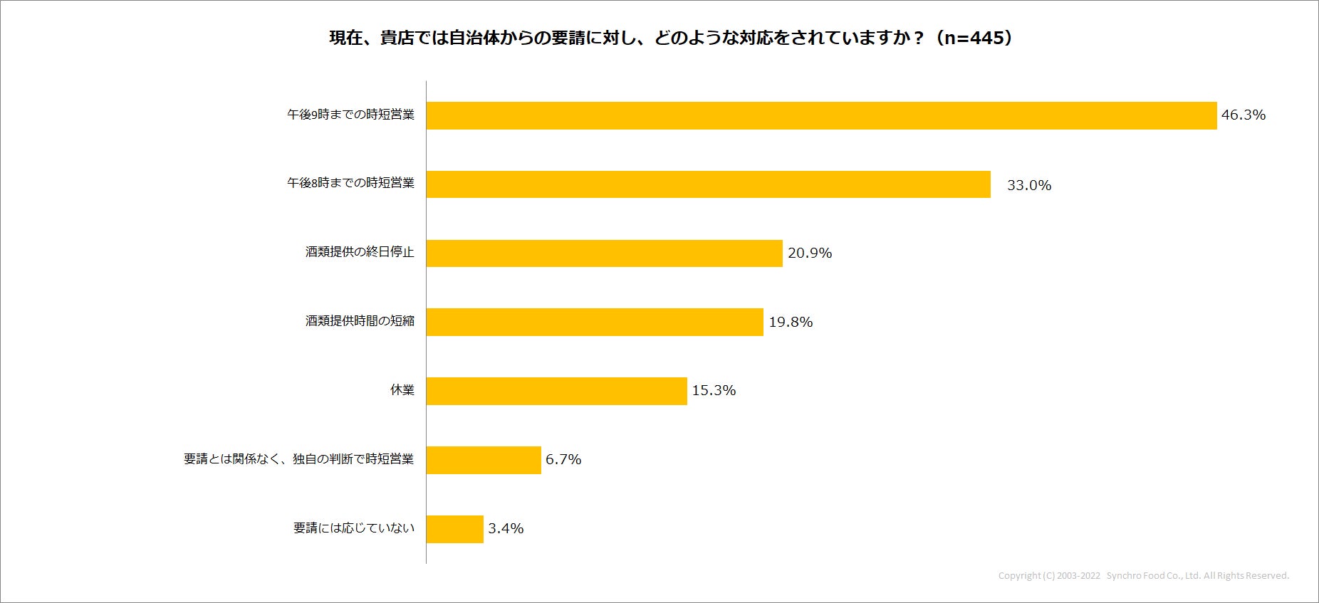 続いて、まん延防止等重点措置の適用地域にある飲食店に対し、自治体の要請に対する対応状況を聞いたところ、最多は「午後9時までの時短営業」との回答で、46.3%。次いで、「午後8時までの時短営業(33.0%)」、「酒類提供の終日停止(20.9%)」との回答が続きました。何らかの形で要請に応じている飲食店が多い一方で、「要請には応じていない」との回答も3.4%ありました。