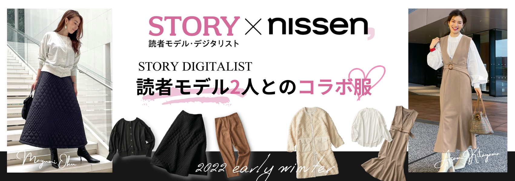 このたび、株式会社光文社発行ファッション雑誌『STORY』の読者モデルグループである「デジタリスト」のお二人とのコラボレーションを企画。ニッセンのメインターゲット層である40代から圧倒的な支持を誇る雑誌『STORY』。そこで活躍するお二人の高感度なファッションセンスで、高見えするきれいめファッションアイテム6点が仕上がりました。