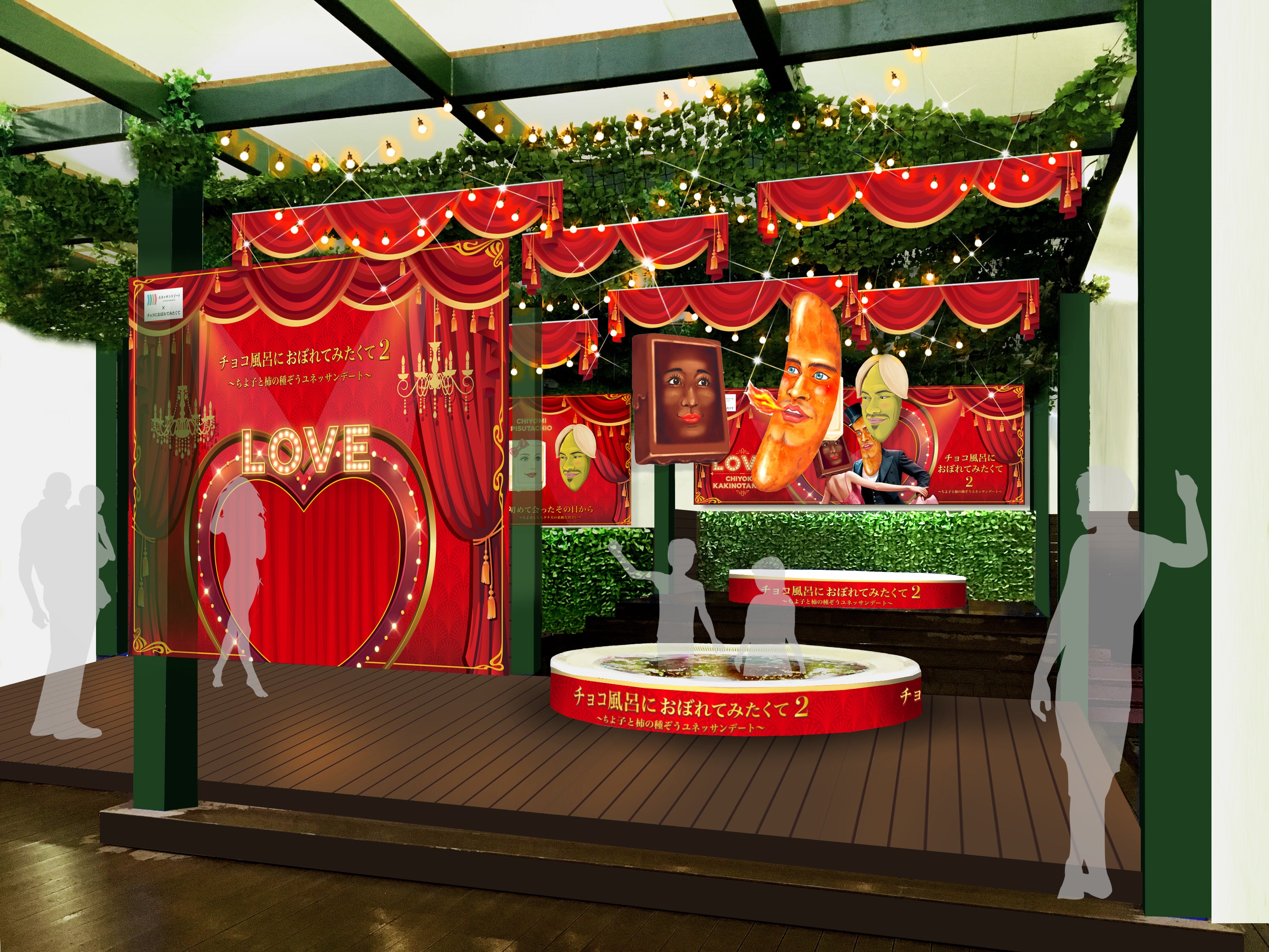 ユネッサンでは、2006 年よりバレンタインシーズンに「チョコレート風呂」を毎年開催しております。19 年目を迎える本年は、チョコレート菓子「チョコにおぼれてみたくて」とのコラボ風呂がテーマを一新して復活!「劇場」をテーマに、バレンタインカラーであるルージュ(赤)で装飾されたコラボ風呂が登場いたします。同商品の メインキャラクター「ちよ子&柿の種ぞう」がミュージカルスターに扮し、絢爛豪華ながらもユーモアと愛(LOVE)にあふれる世界へ、心に残るほどの衝撃とともに皆さまを誘います。