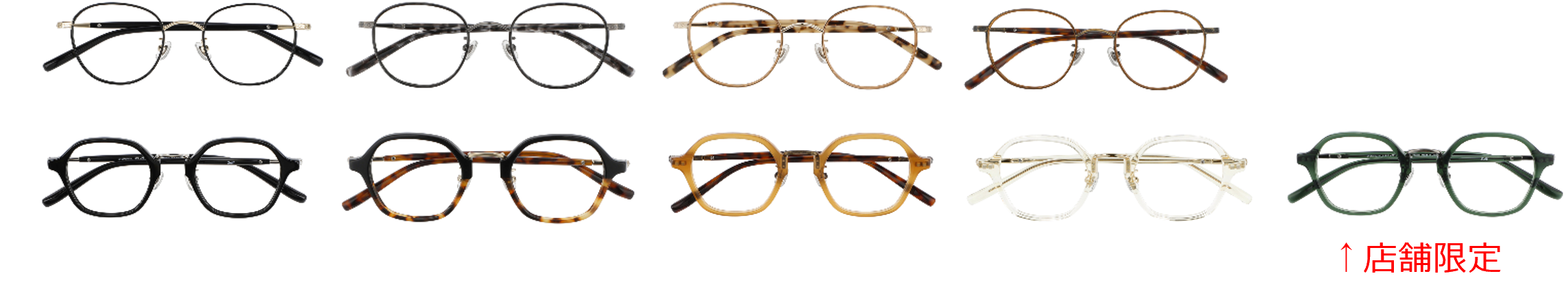【2段目左から】ZF221004_14E1(ブラック)、ZF221004_19E1(べっこう柄)、ZF221004_42A1(ライトブラウン)、ZF221004_50A1(ライトイエロー)、ZF221004_62A1(ダークグリーン)