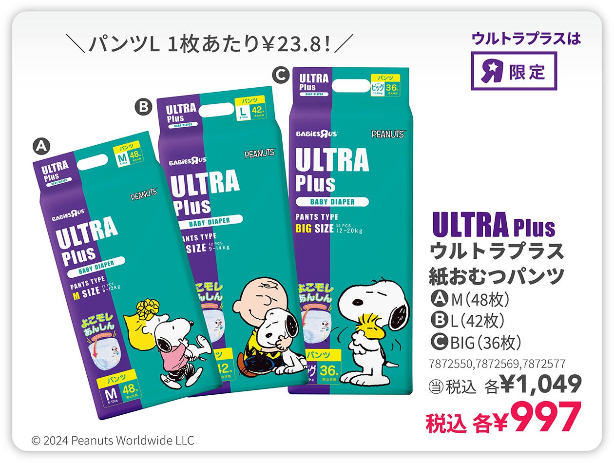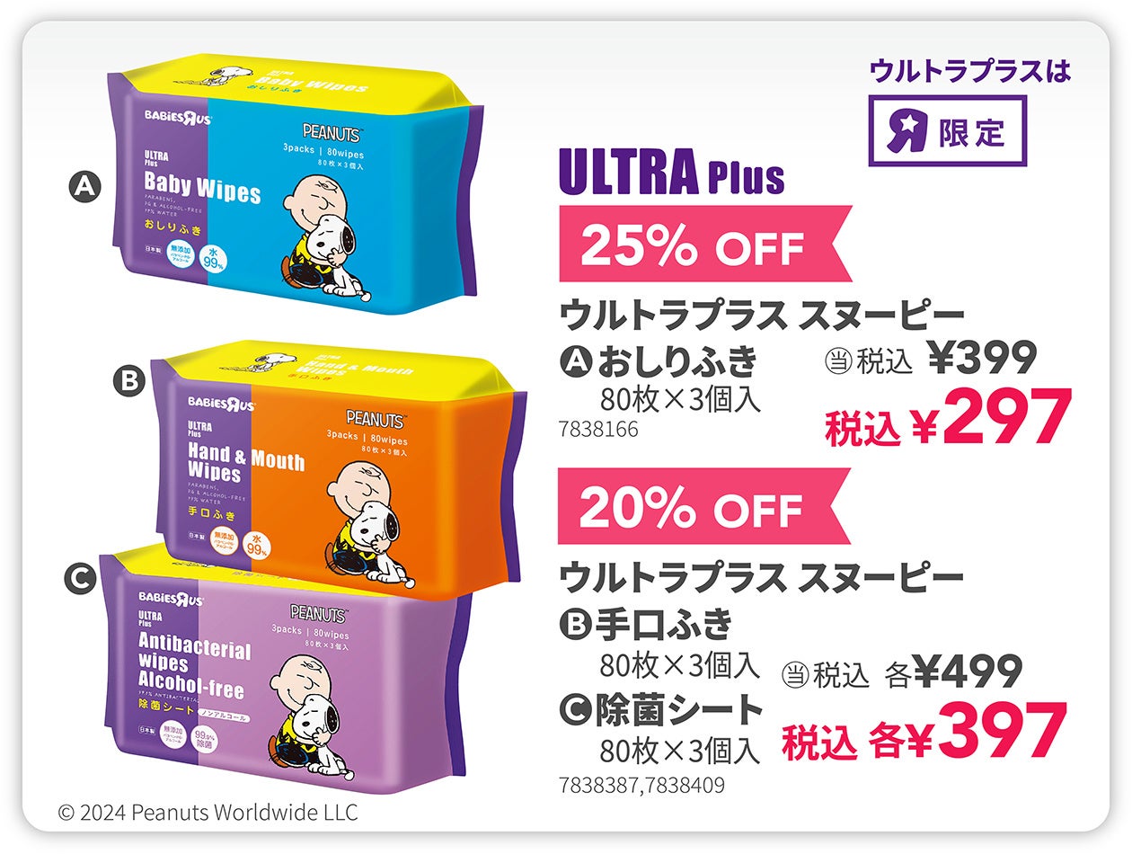 ベビーザらスのオリジナルブランド「ウルトラプラス(ULTRA Plus)」シリーズからは、スヌーピーデザインの紙おむつ・おしりふき・手口ふき・除菌シートが特別価格となり、子育て中のご家族を応援します。そのほか、ベビーフード・ベビードリンクも特価となり、ベビーの必需品をお得に揃えるチャンスです。昨今は生活必需品をはじめとするさまざまな商品の価格高騰が続き、家計への負担を感じるご家庭も少なくありません。ベビーザらスでは、こうした状況のなかでもお子さまとの毎日を安心して過ごしていただけるよう、育児に欠かせないアイテムをお求めやすい価格でご提供し、家計と子育ての両面を応援いたします。